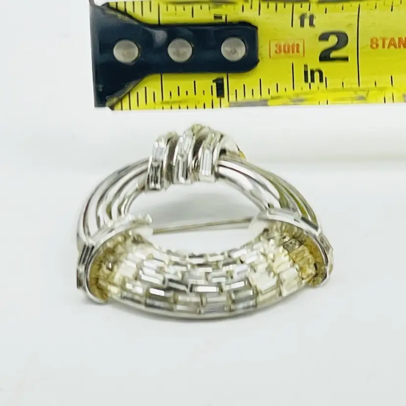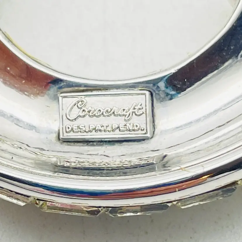 Signed Corocraft brooch featuring clear baguette rhinestones in a woven basket-weave style silver tone setting. Features: Signed Corocraft Clear baguette rhinestones Silver tone finish Woven basket-weave motif, 1.5 inch Secure rollover clasp Classic mid-century style Corocraft Brooch, Vintage Rhinestone Pin, Baguette Rhinestone Brooch, Silver Tone Brooch, Basket Weave Pin, Mid Century Costume Jewelry, Collectible Coro Jewelry, Retro Statement Brooch