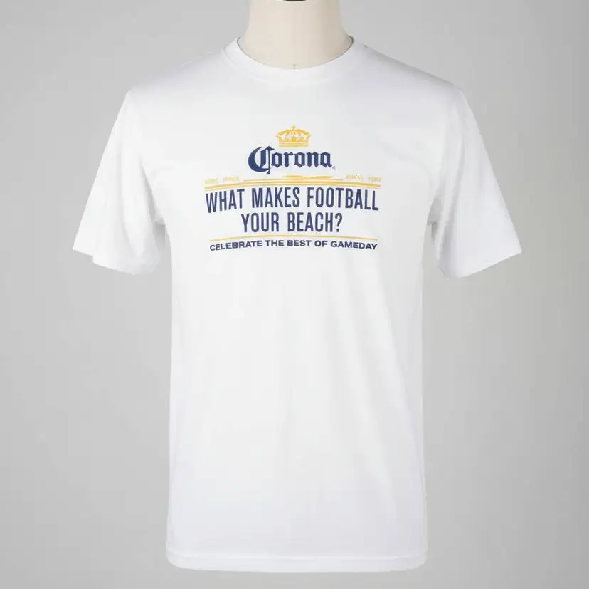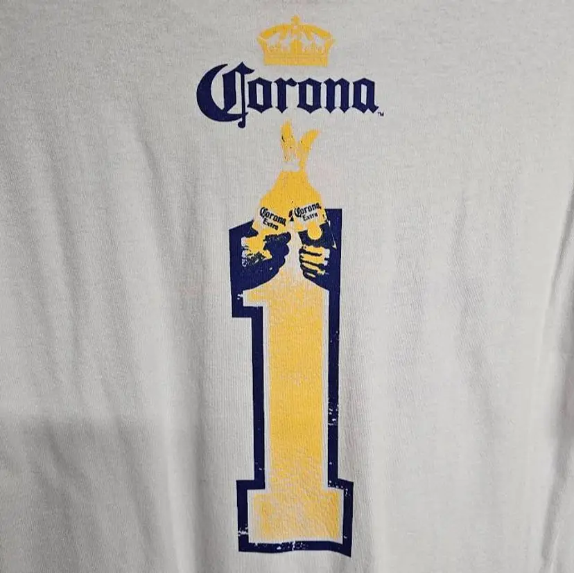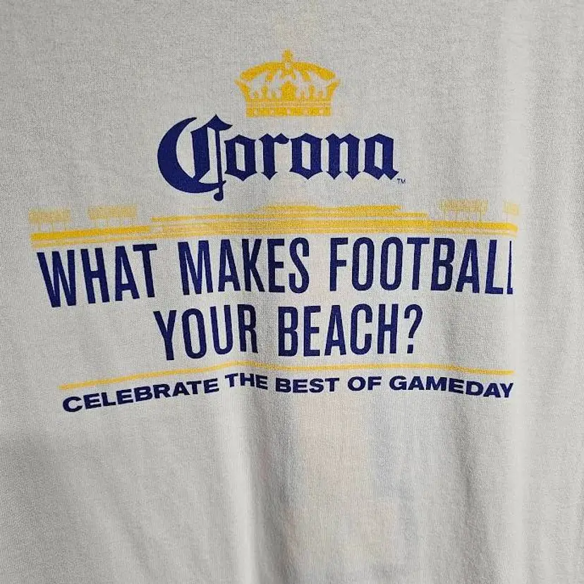 Front Design: “Corona – What makes football your beach? Celebrate the best of gameday.” Back Design: Corona logo with a bold Number One graphic. Style: Casual short sleeve crew neck tee, perfect for any relaxed occasion. Color: White Size: Large This shirt is perfect for: Cinco de Mayo parties Summer days at the lake or beach Backyard BBQs and gameday fun Your own at-home Corona party! Condition: Brand New