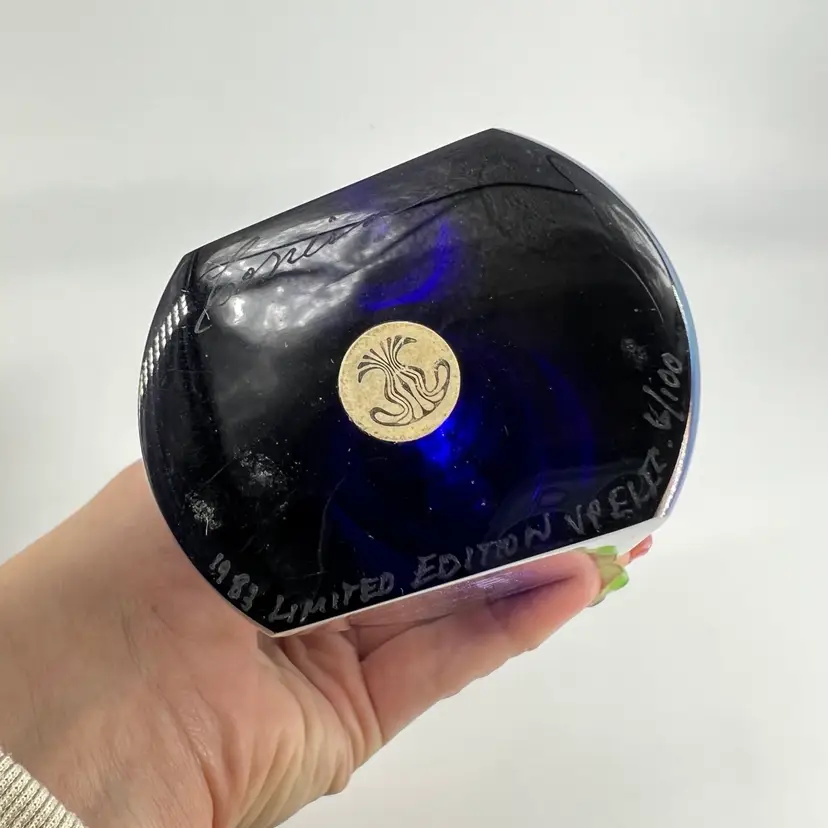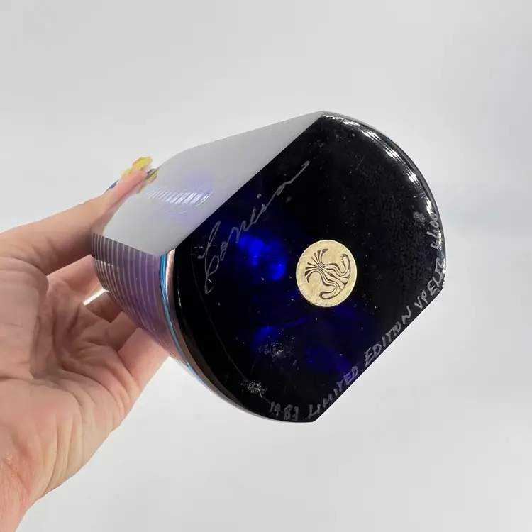 This perfume bottle is a limited edition perfume. It is signed and numbered 6/100. It measures approx 7” tall. There are no chips or cracks.