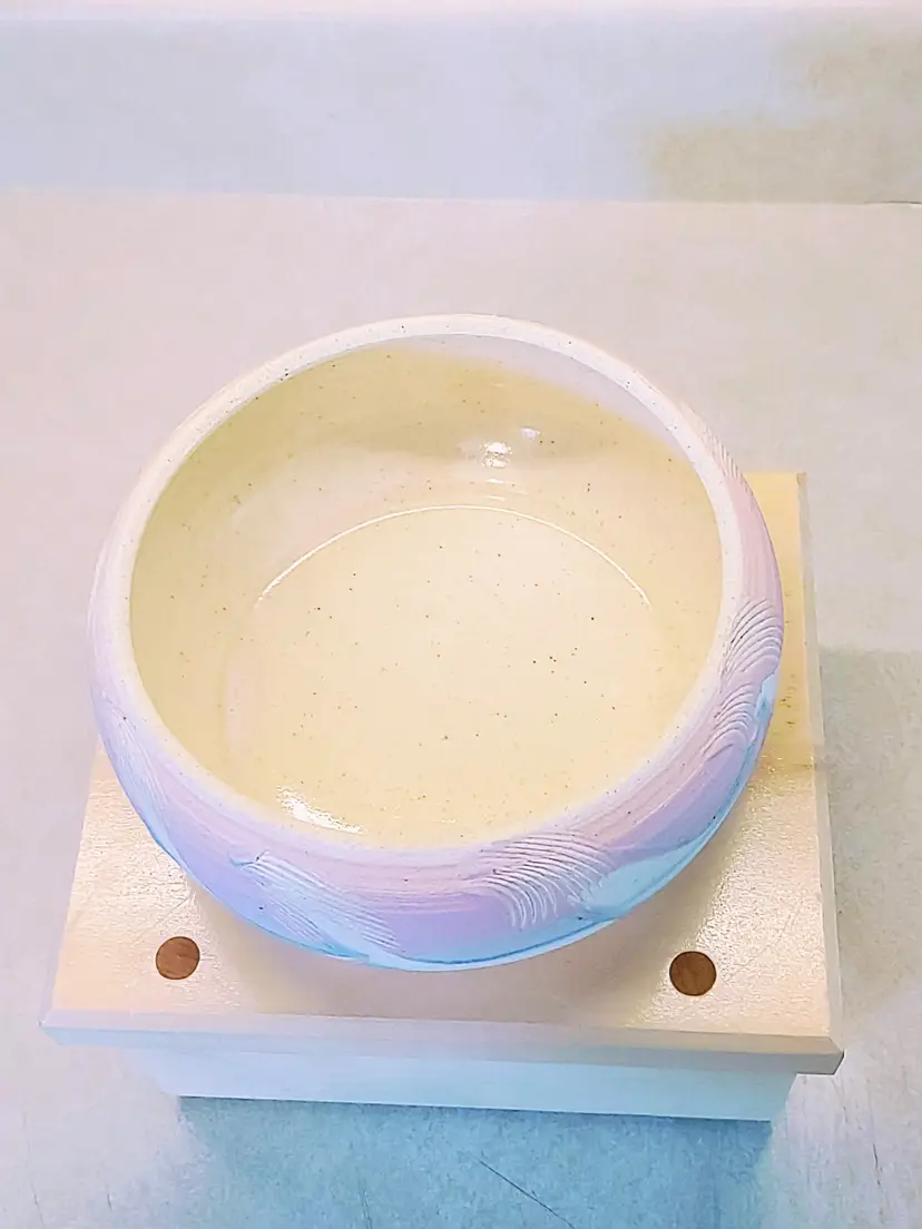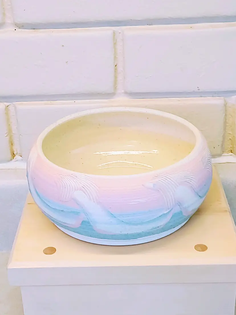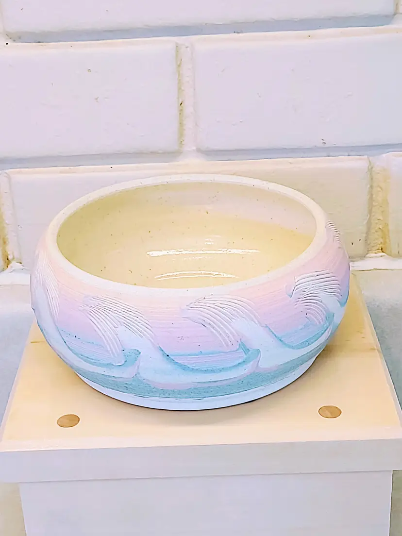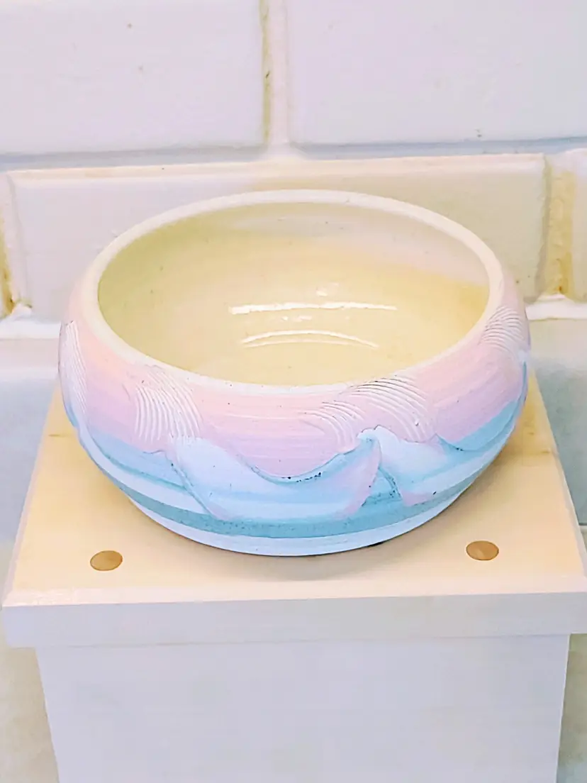 This vintage pottery clay bowl is a beautiful hand-painted art piece featuring a pastel ocean waves pattern. Made in America in 1988, this decorative bowl is a unique and one-of-a-kind creation by a hobbyist artist. The multicolor design and production technique of pottery make it a charming addition to any home decor, particularly for those who appreciate handmade art and vintage pieces from the late 20th century.