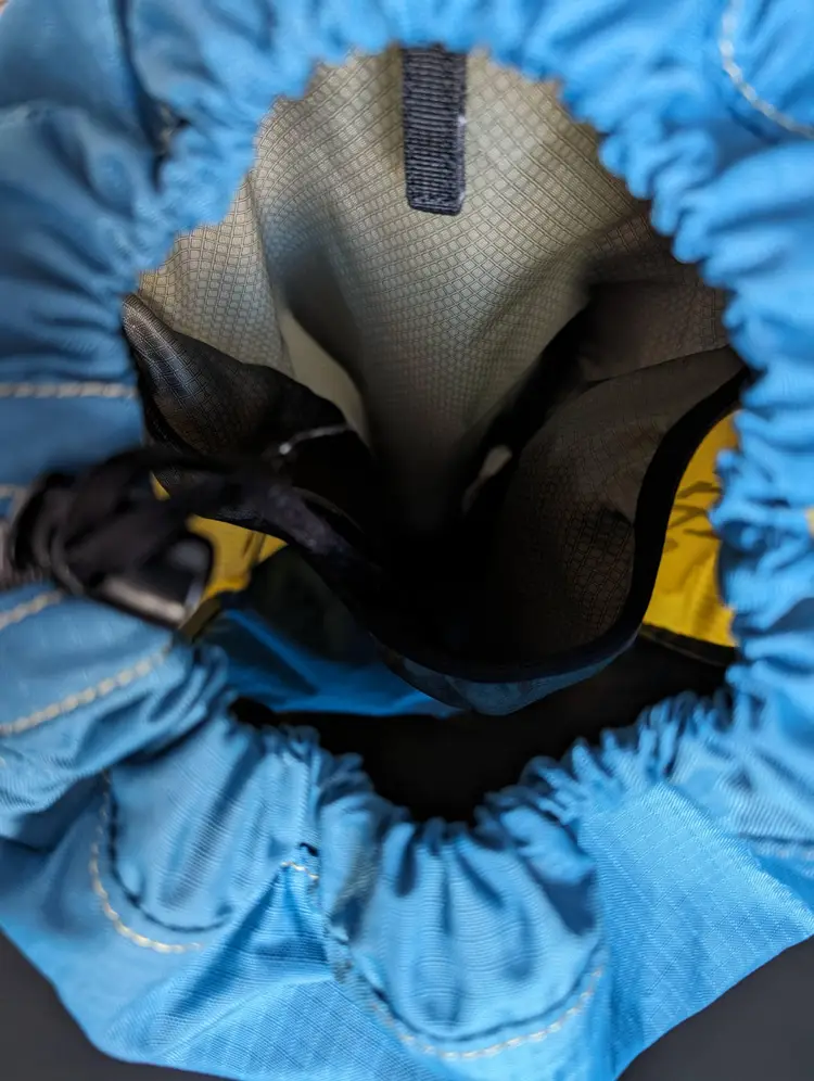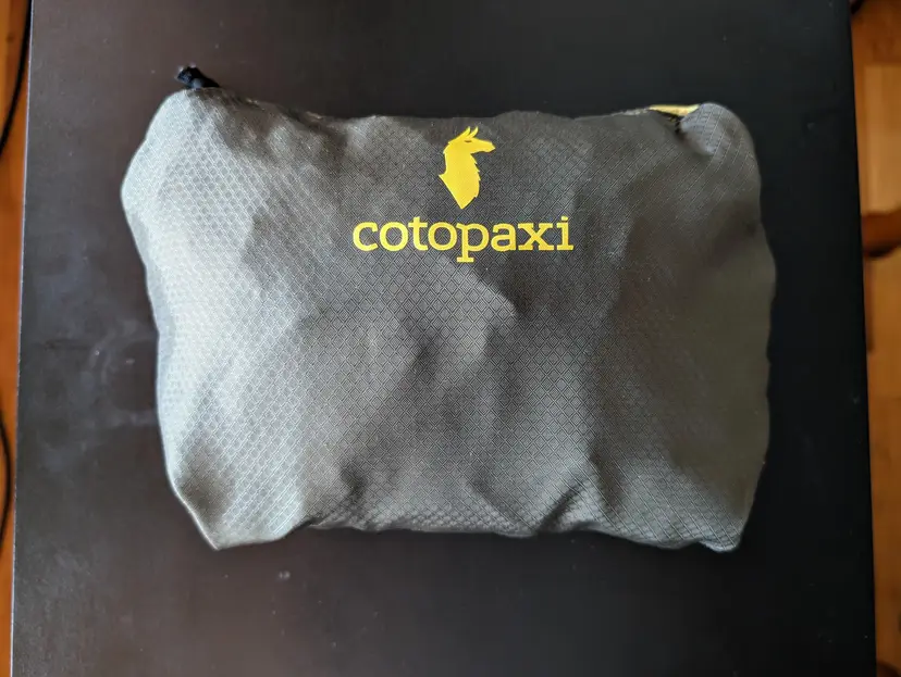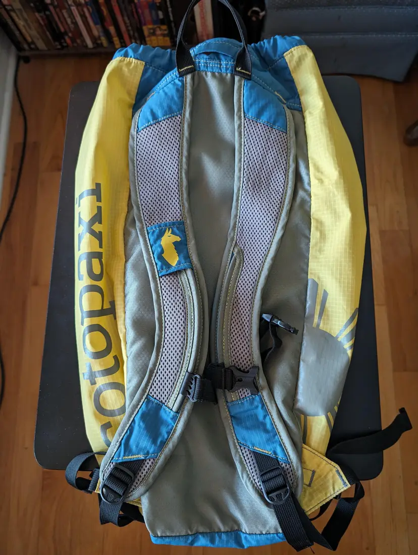 In used but good condition and clean. A lightweight packable backpack that can fold into its own pocket. Drawstring top, has a waist strap and passthrough with loop/sleeve for hanging a water bladder. Lightweight, good for outdoor/travel.