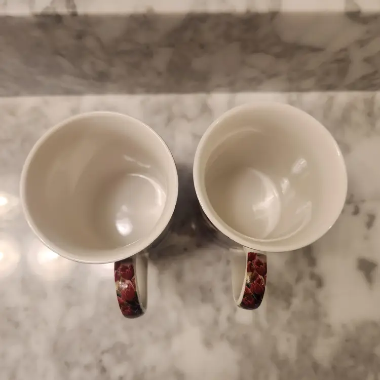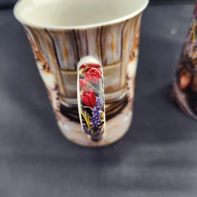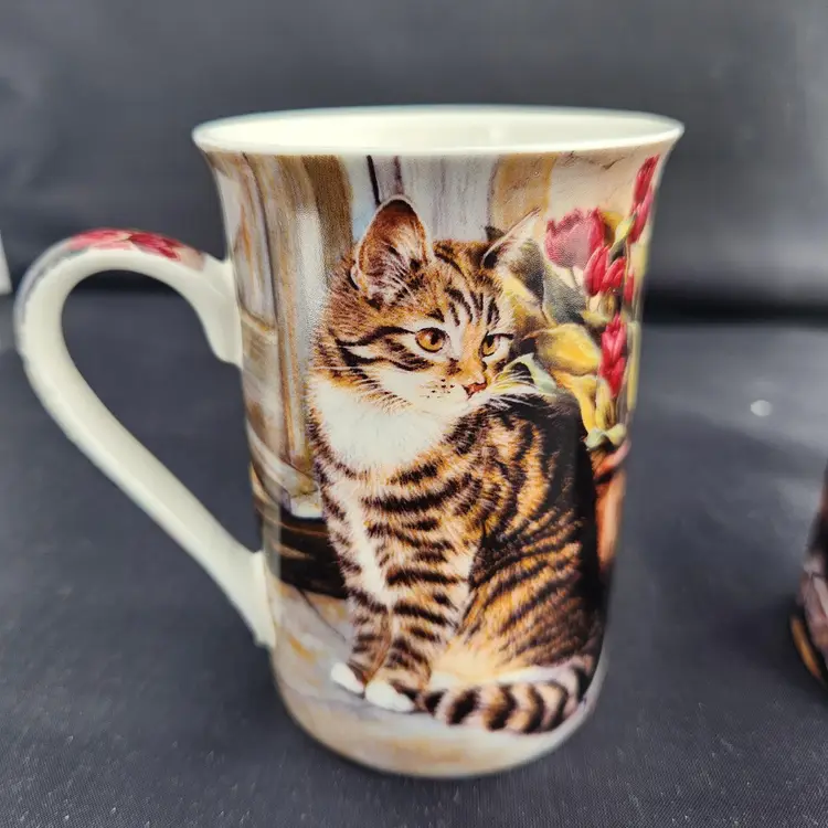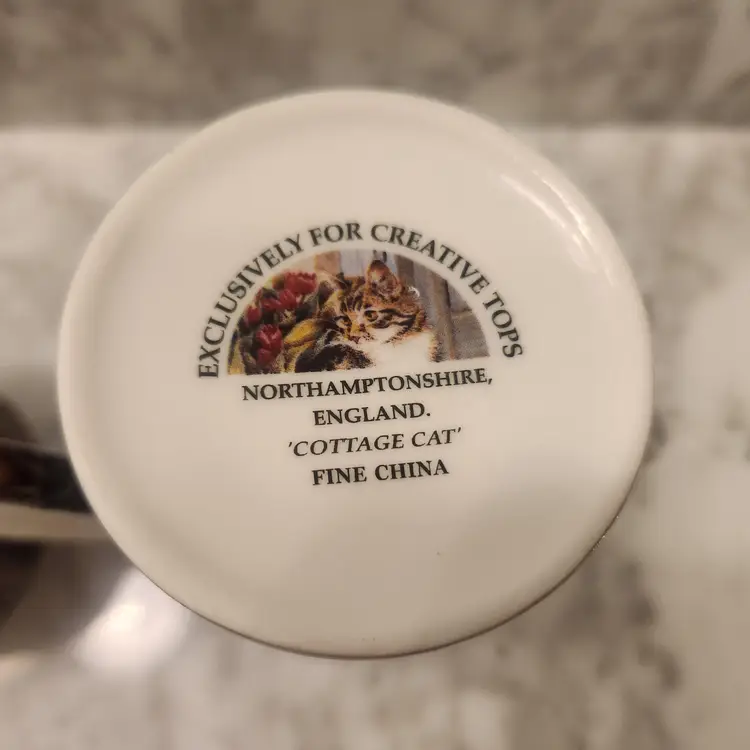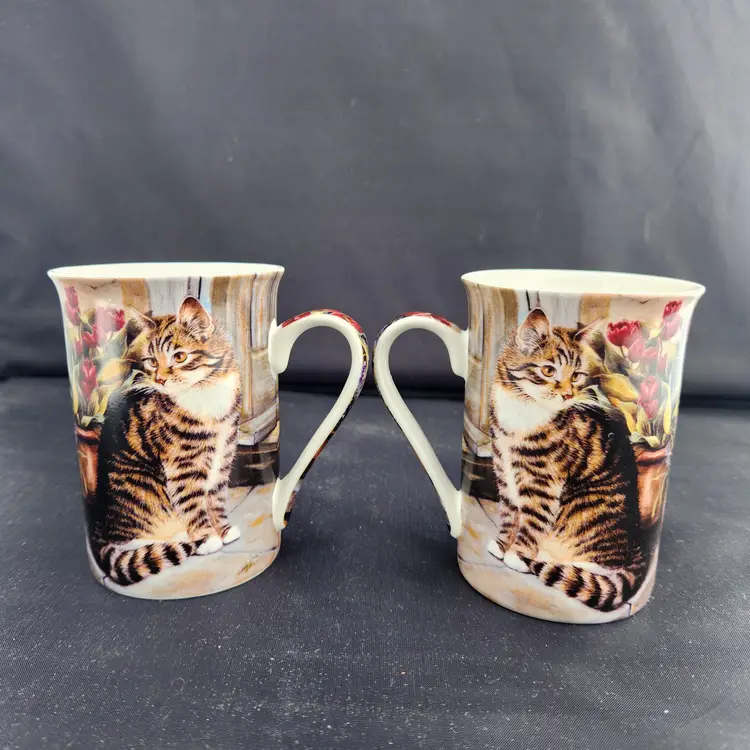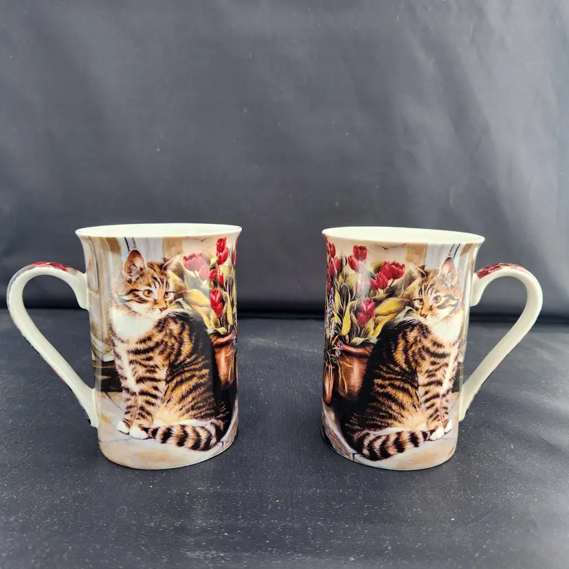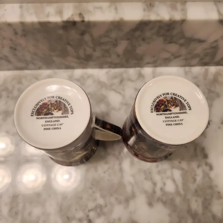 Cute tabby kitty mugs, nice quality china made in England for Creative Tops (they are not the maker but the distributor.) They began in 1996 and I believe these are from around that time because of the price tag appearance and where they were made.