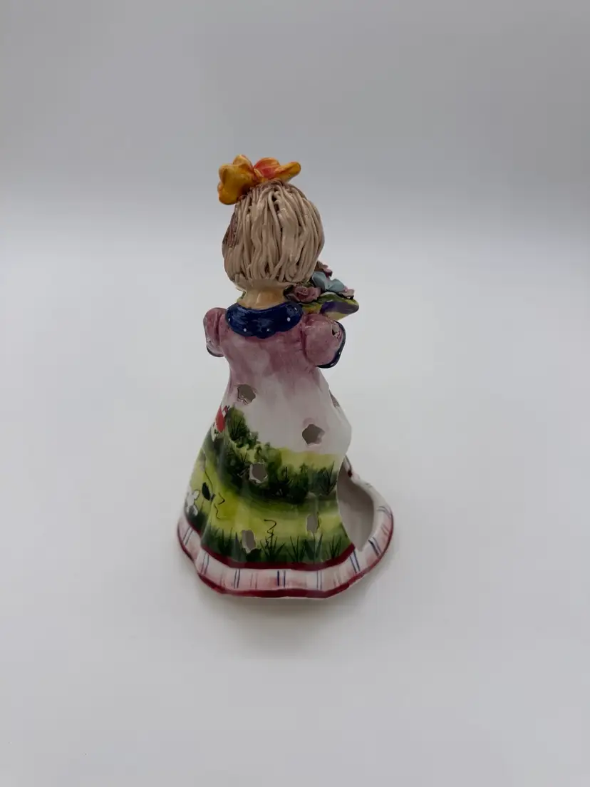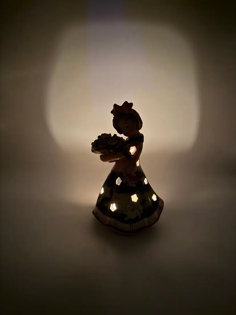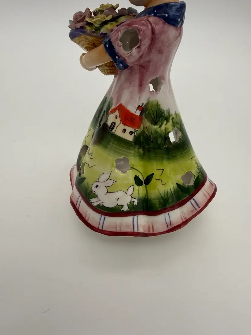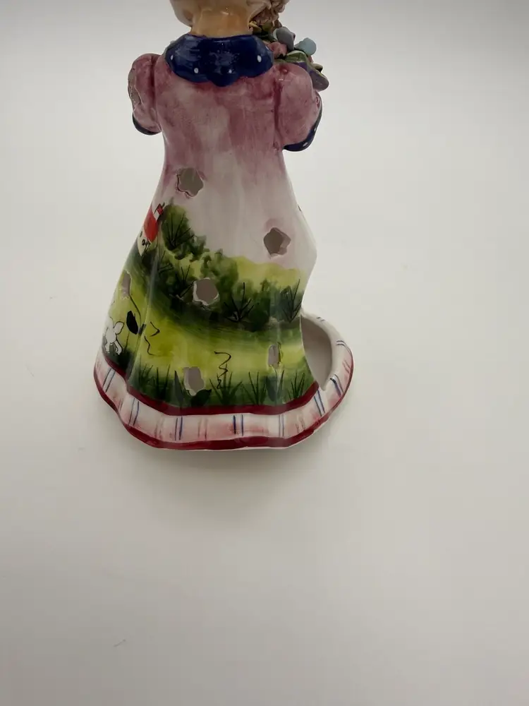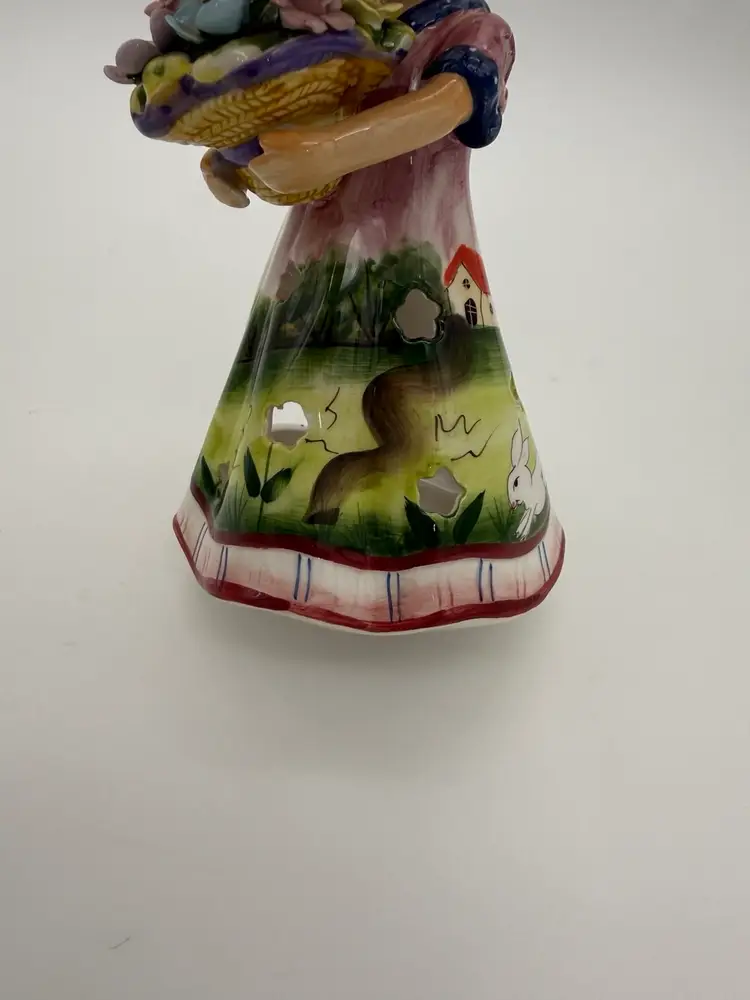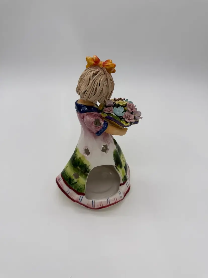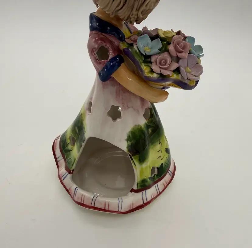 This vintage Cottagecore Tealight Candle Holder features a young girl with spaghetti hair and a flower basket, filled with 3-D flowers, adding a charming and whimsical touch to any space. Hand-painted with a glossy finish, this asymmetrical ceramic piece exudes a Mid-Century Modernism style perfect for all occasions. Whether placed on a tabletop, furniture, or as a centerpiece, this small candle holder is sure to delight with its 3D effect and multicolor design. A unique and lovely addition to any room, especially for those who appreciate Victorian, Easter, and Spring themes. 4.5” X 7.5”