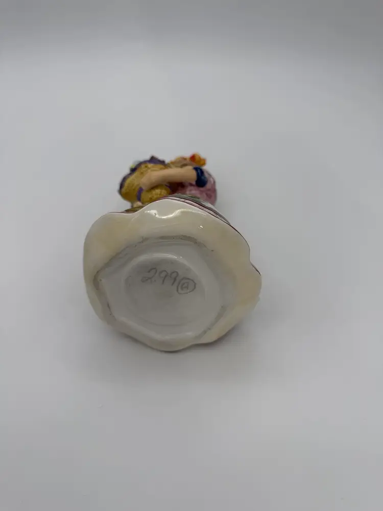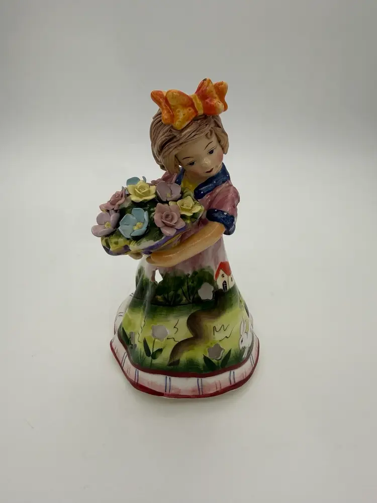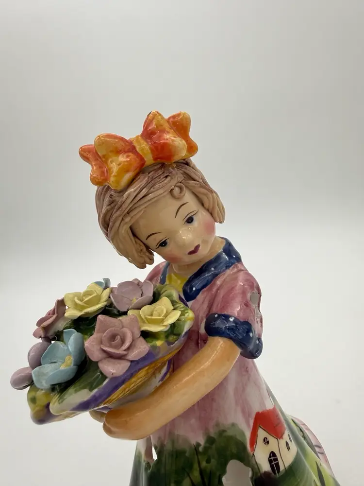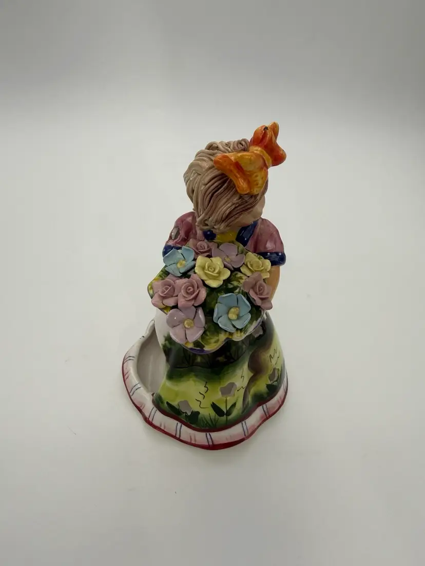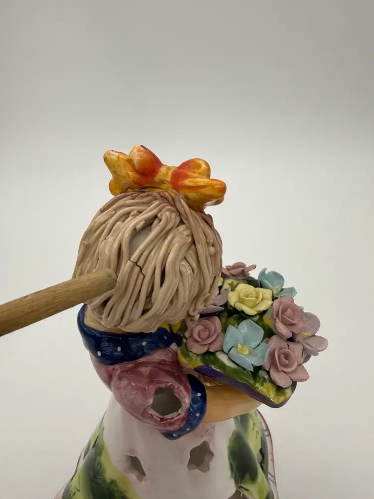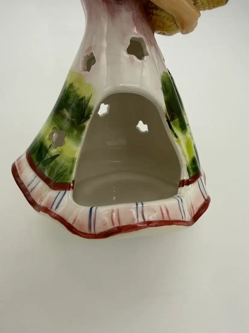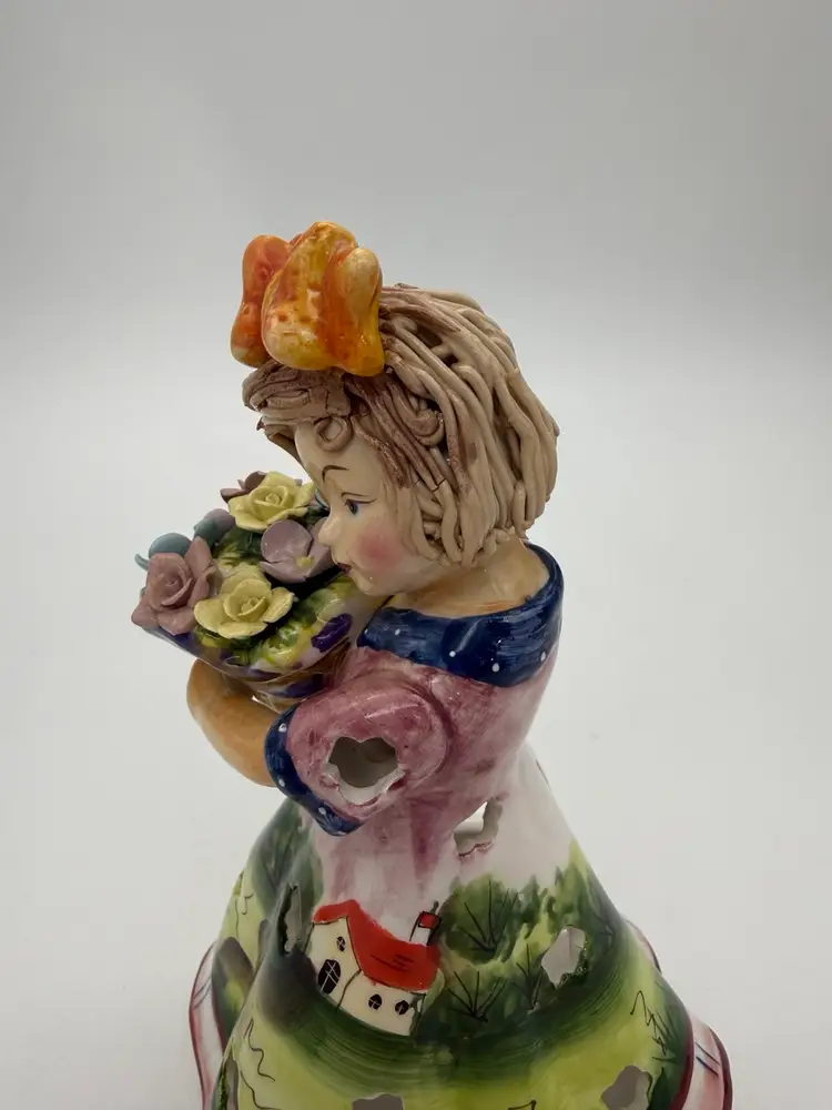 This vintage Cottagecore Tealight Candle Holder features a young girl with spaghetti hair and a flower basket, filled with 3-D flowers, adding a charming and whimsical touch to any space. Hand-painted with a glossy finish, this asymmetrical ceramic piece exudes a Mid-Century Modernism style perfect for all occasions. Whether placed on a tabletop, furniture, or as a centerpiece, this small candle holder is sure to delight with its 3D effect and multicolor design. A unique and lovely addition to any room, especially for those who appreciate Victorian, Easter, and Spring themes. 4.5” X 7.5”