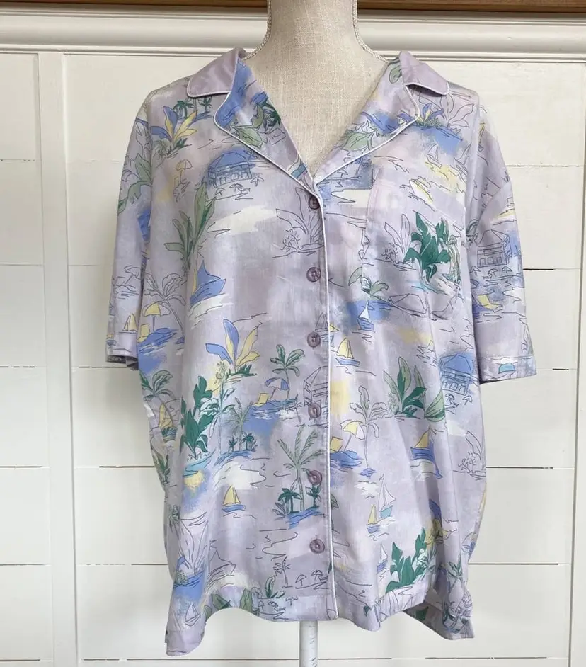 Cotton On Tropical Short Sleeve Shirt Lilac Bloom Collared Button up lightweight blouse, great for Summer and beach vacations.