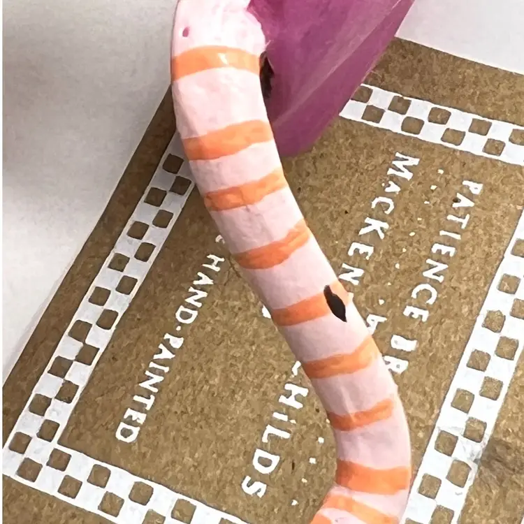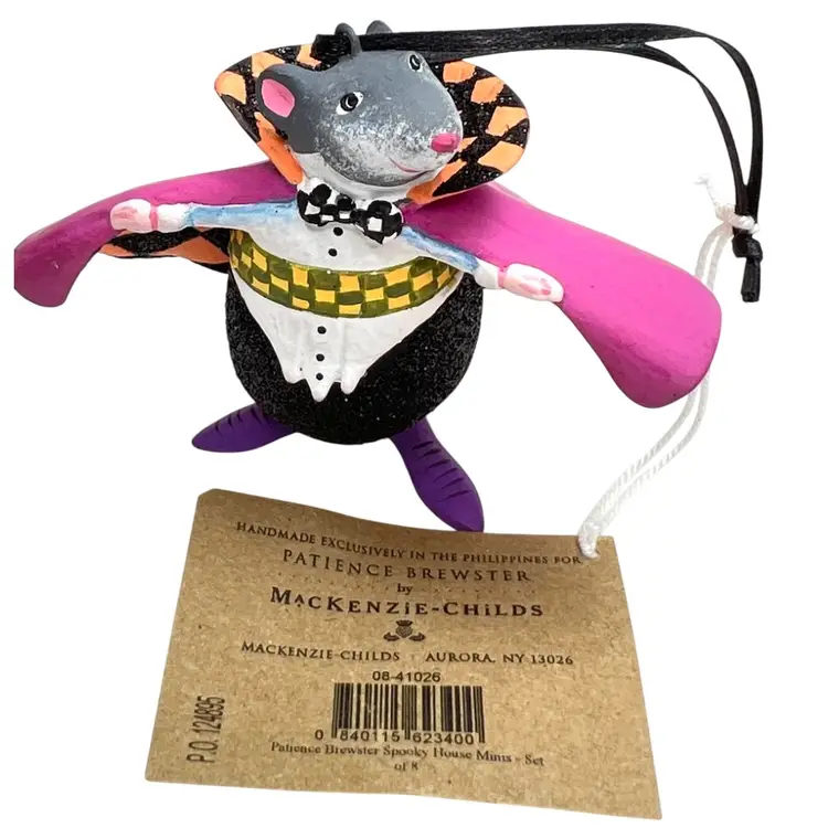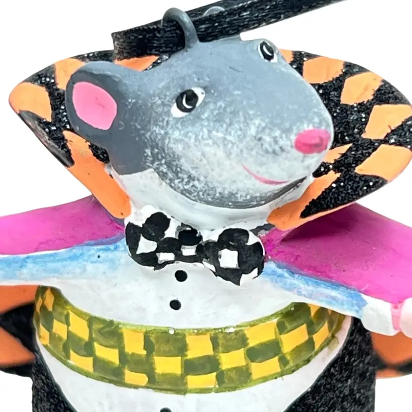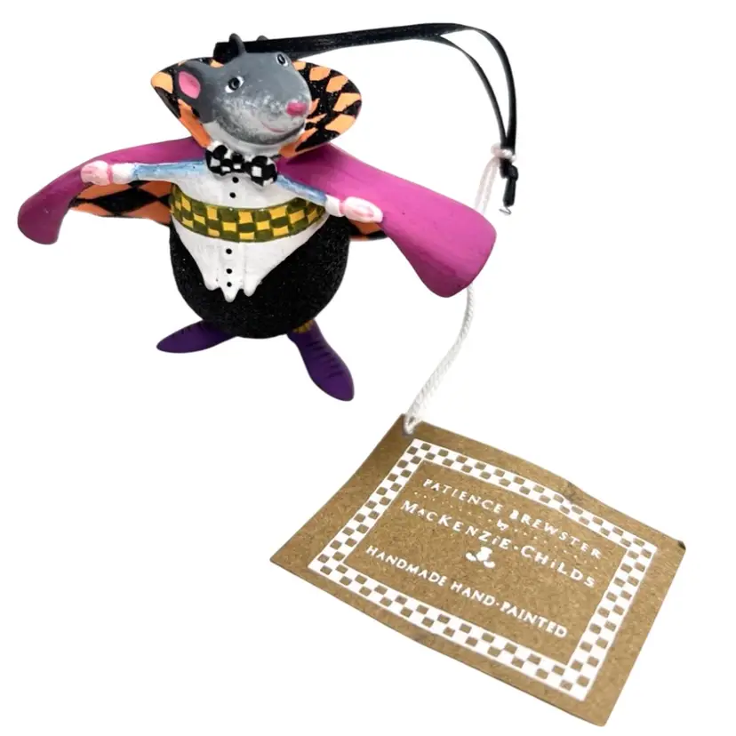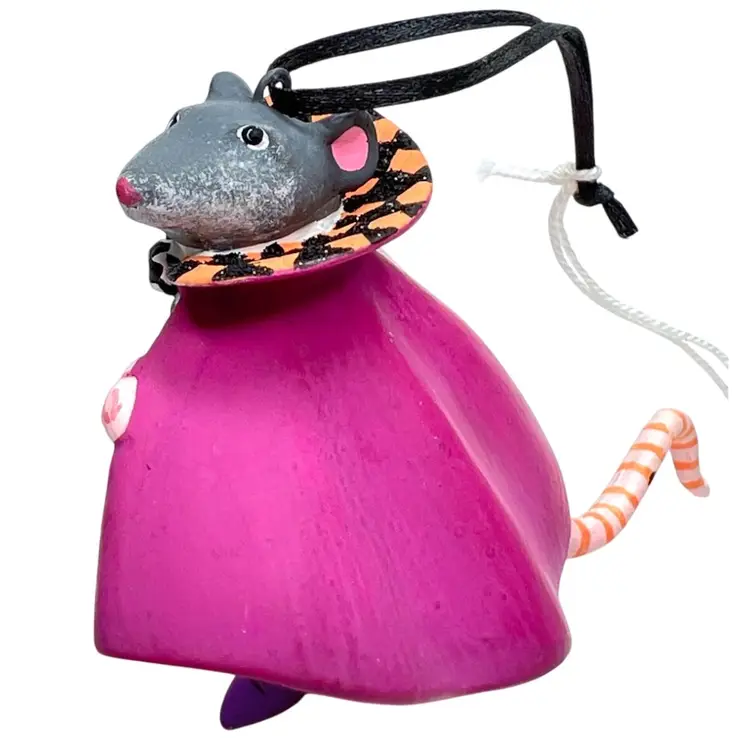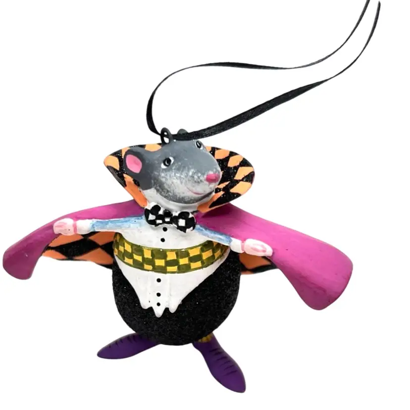 Handmade, Handpainted Fabulous magenta colored cloak with black & orange harlequin pattern interior. Mr. Ratula prefers to be addressed as “Count” as his family inherited the title as part of a countryside estate in Ratsylvania. The Count looks dapper in his polka dot bow tie, checked cummerbund, and purple shoes. Ready for an evening of dining on the local townsfolk. 🩸 His favorite meal is blood pudding, kidney pie, and ratatouille with a nice Chianti. Black string for hanging suspended like an ornament or bat 🦇 . Original tag. Made of some type of resin. Weighs 1.2 ounces. Height 2-1/4” Length 3” Width 1-1/2” Condition: New with tag. His tail has 1 spot with black paint dab- see last photo.