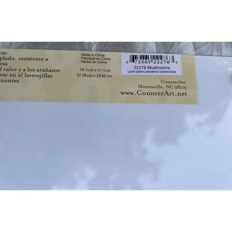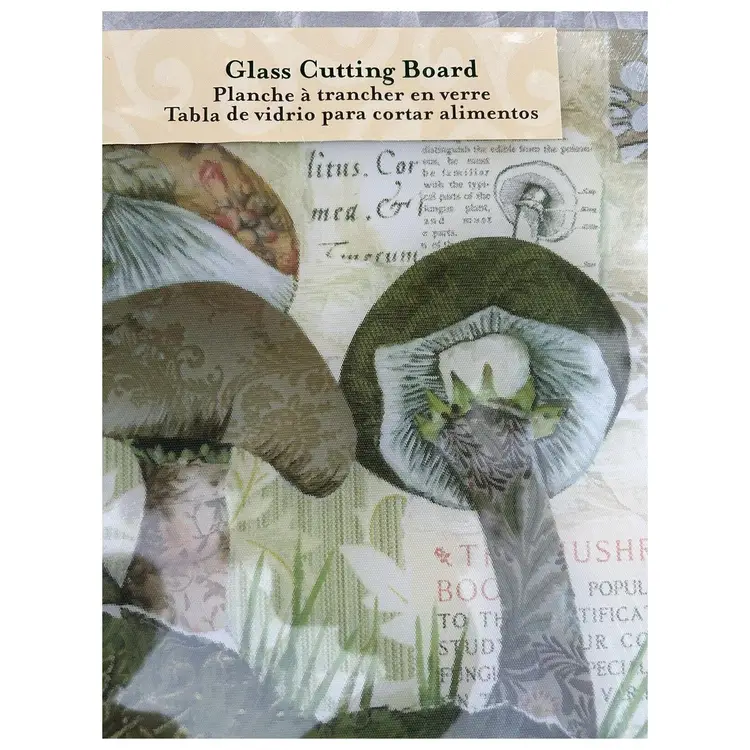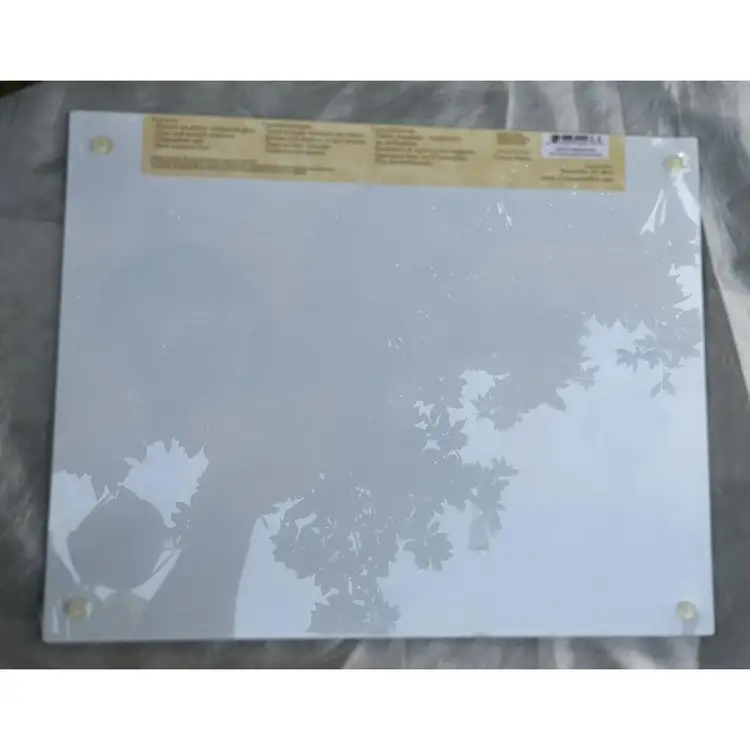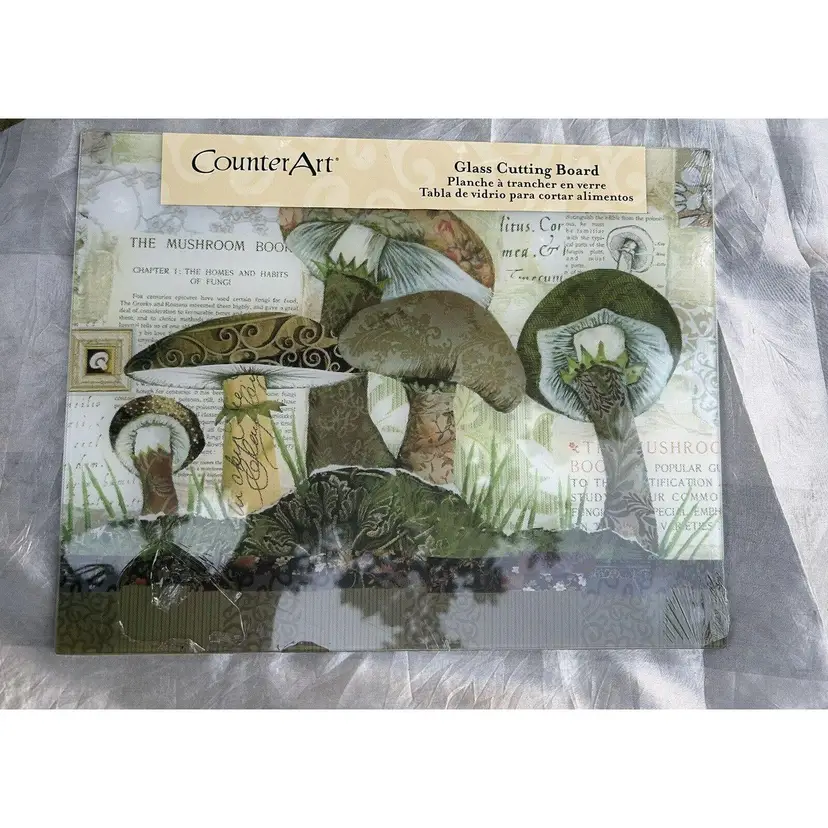 Size 14 7/8 in x 11 3/4 in Shatter resistant, tempered glass. Heat and scratch resistant. Dishwasher safe. Skid resistant feet. Plastic front and back is torn. Cutting board is sealed. See pictures.