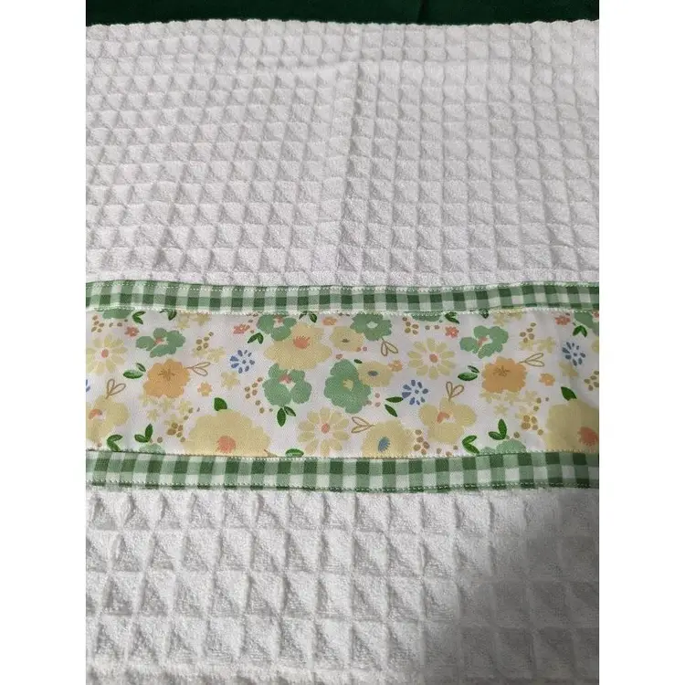 This listing is for a set of 2 kitchen towels and are Handmade (by me). White kitchen / tea towels are embellished with with green and white florals and green gingham trim.