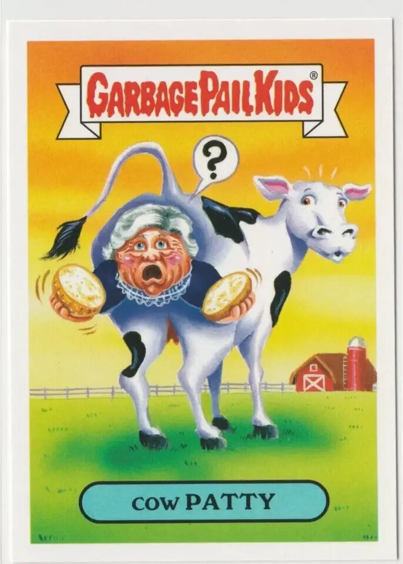 Cow Patty #7b of 9 Topps Garbage Pail Kids GPK 2018 We Hate the '80s '80s TV Shows & Ads Sticker subset Wendy's Where's the Beef? ad campaign