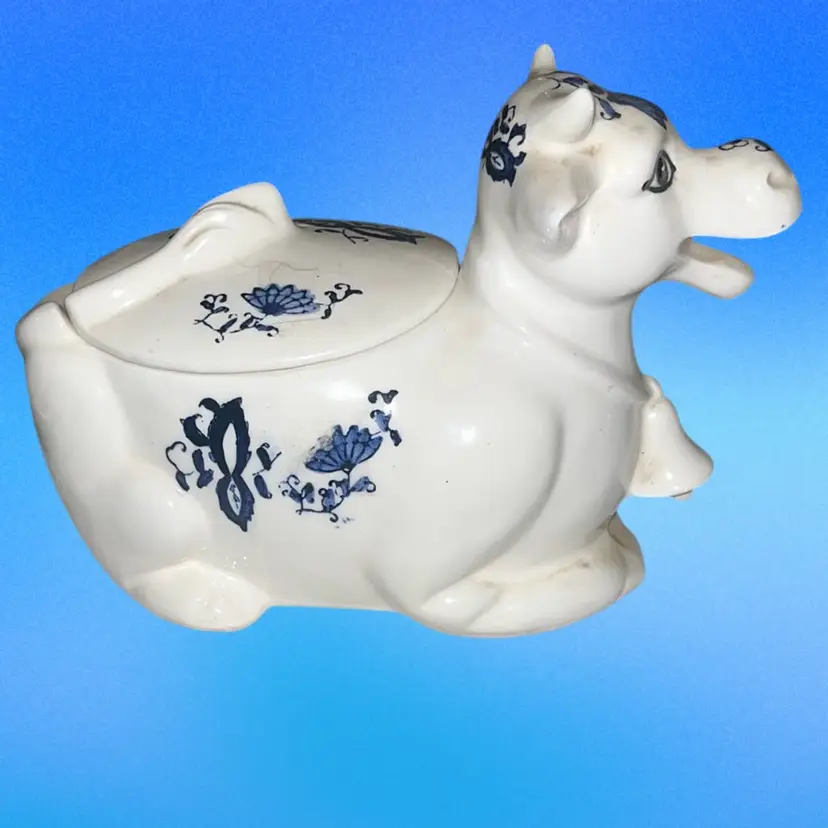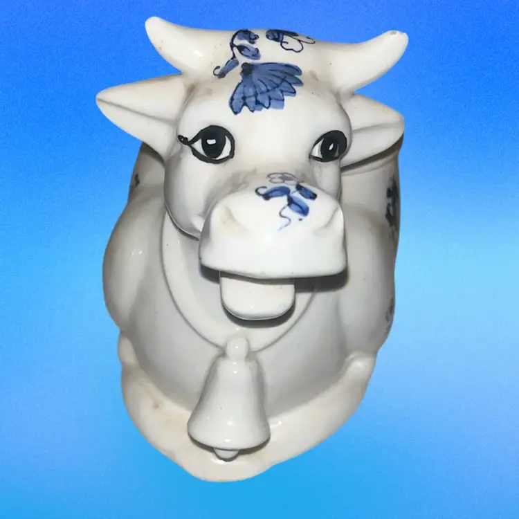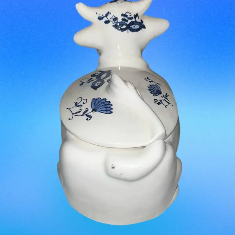 Cow sugar dish. So cute with its happy smile. Delft in style. 7 inches long 5 inches tall 3 inches in diameter