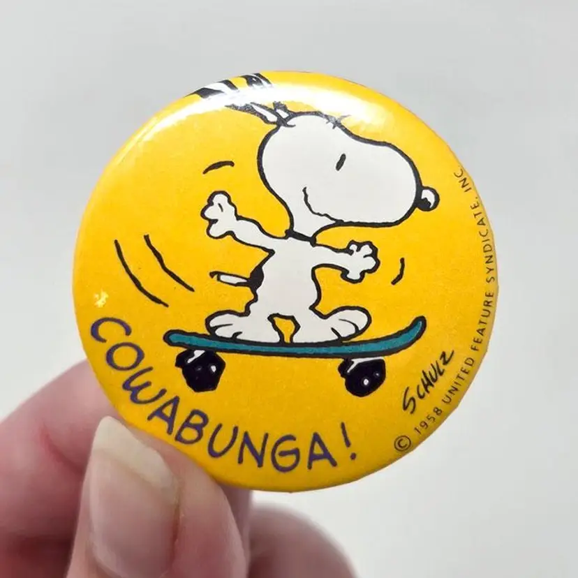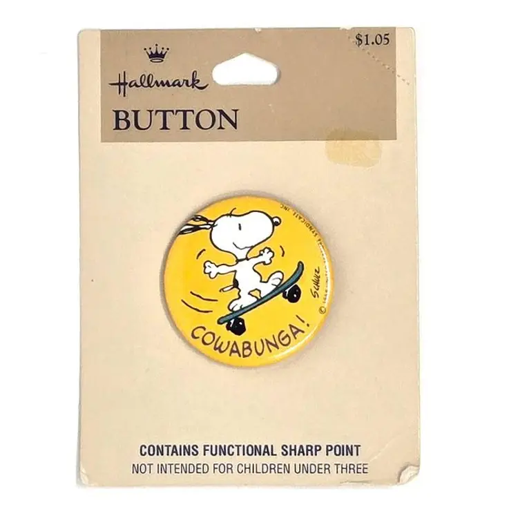 Show off your love for Snoopy with this vibrant 'Cowabunga' button featuring Snoopy on a skateboard. This collectible Hallmark button from the 1990s is perfect for any Peanuts fan. Pin it to your bag, jacket, or hat for a fun and nostalgic touch. Pin and original card show some minor shelf wear. About 1.5" in diameter.