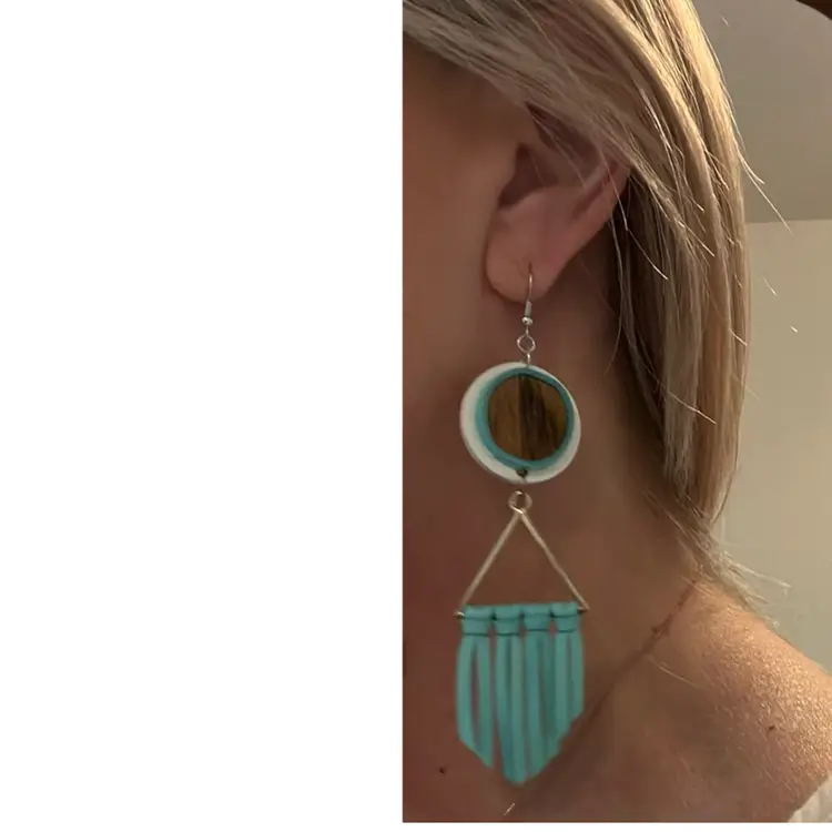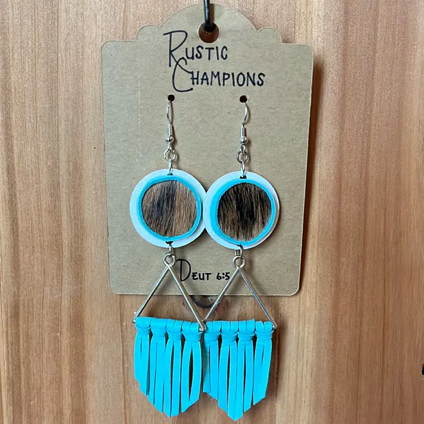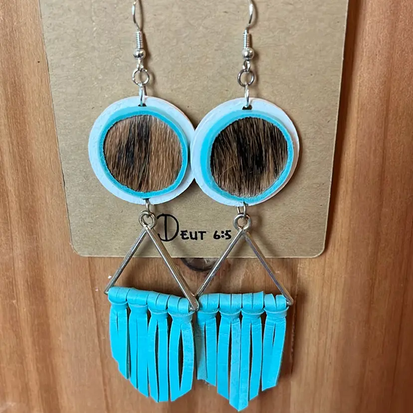 These measure approximately 4.25” from the lob. They are turquoise colored leather with cowhide centers. Very light weight and easy to wear! All my earrings are made with hypoallergenic findings and come with silicone backs.