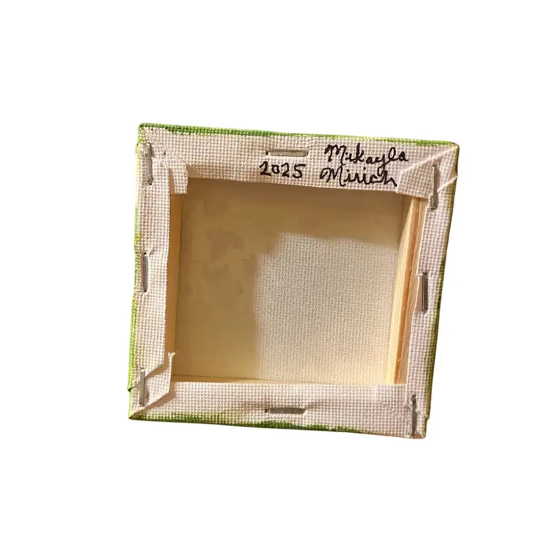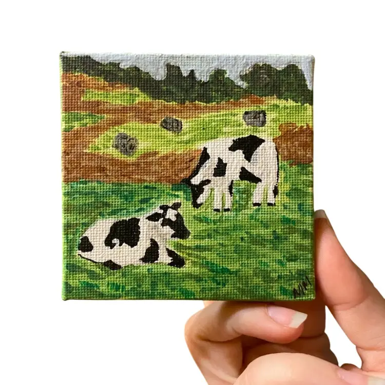 Cows Hand painted Acrylic Canvas- Signed MM on front and Mikayla Mirich 2025 on back - Approximately 3 X 3 This canvas is hand-painted with cows in a field.