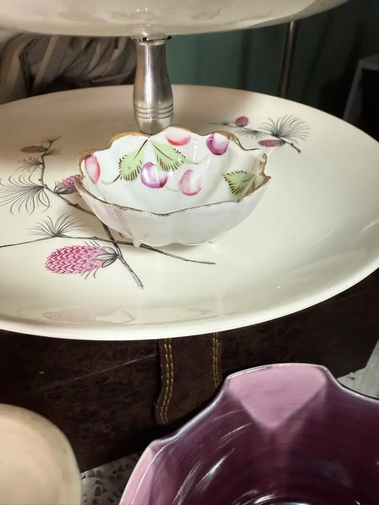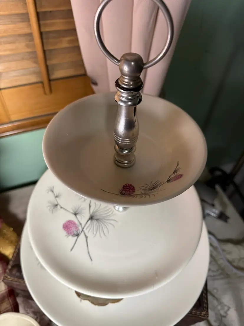 3 tier wild clover pattern tidbit tray. The sections are divided by plastic decorative elements with a metal. Beautiful purple accents on off white