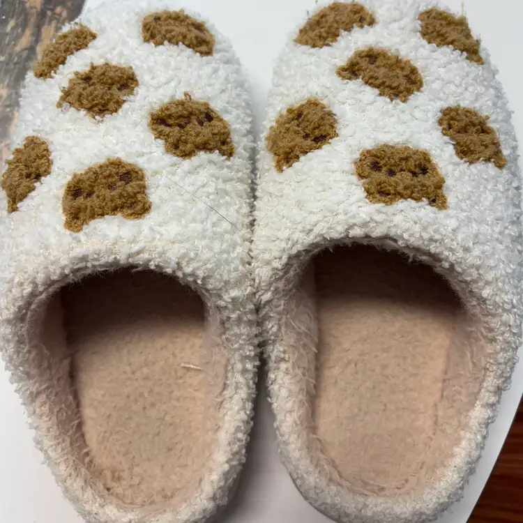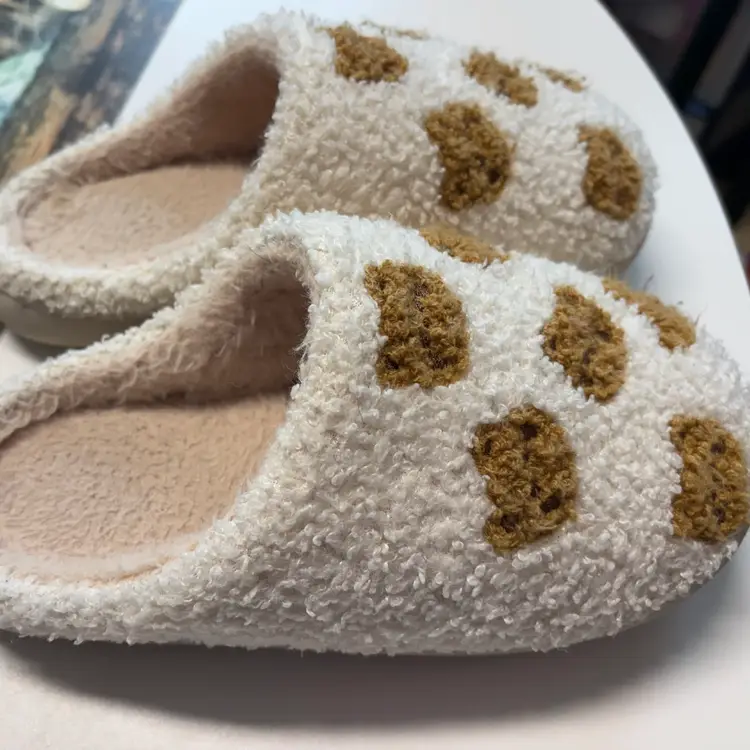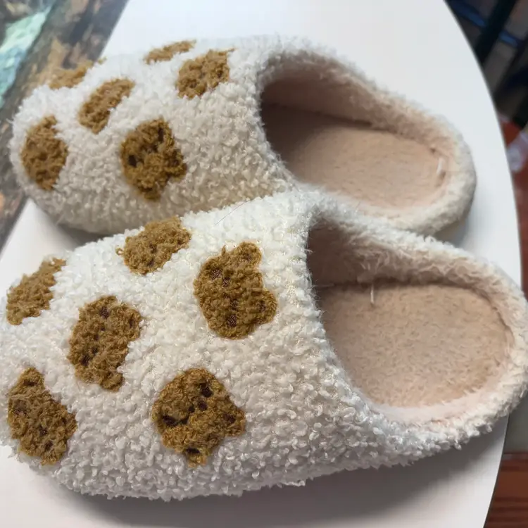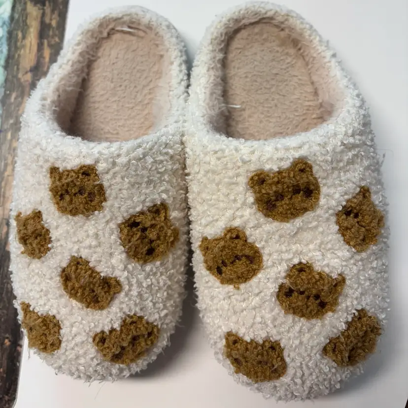 Soft fuzzy cream slippers with brown teddybear pattern. Plush interior for comfortable wear. Easy slip-on design.