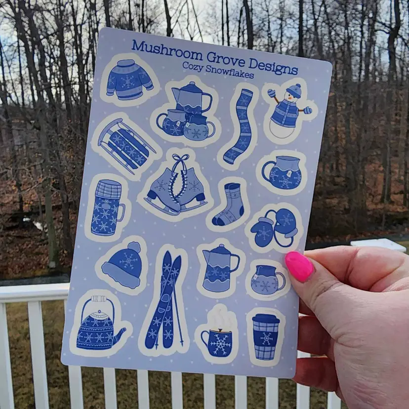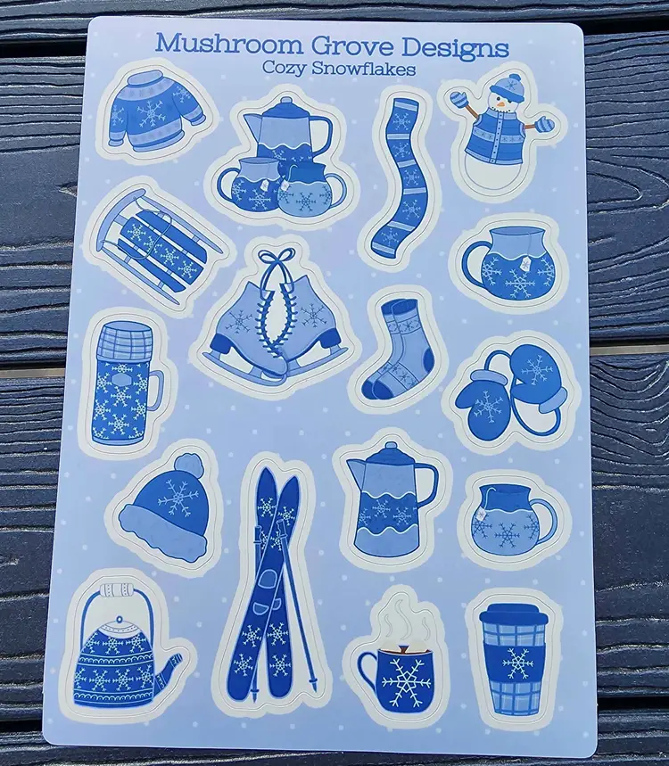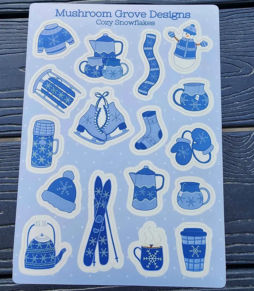 This sticker sheet features 17 stickers of cozy winter items in shades of blue. Each sticker sheet measures 5x7 inches (12.7x17.8 cm) with each sticker measuring approximately 0.5x0.75 inch (1.27x1.9 cm) to approximately 2x1.5 inches (5x3.8 cm).
