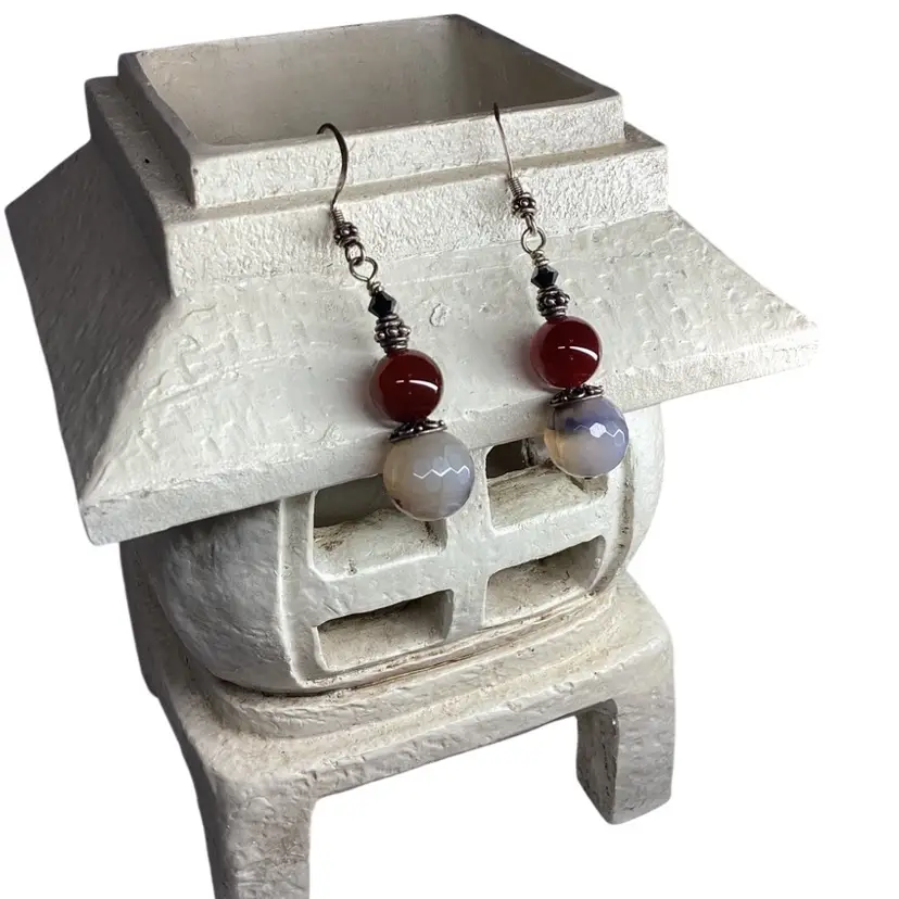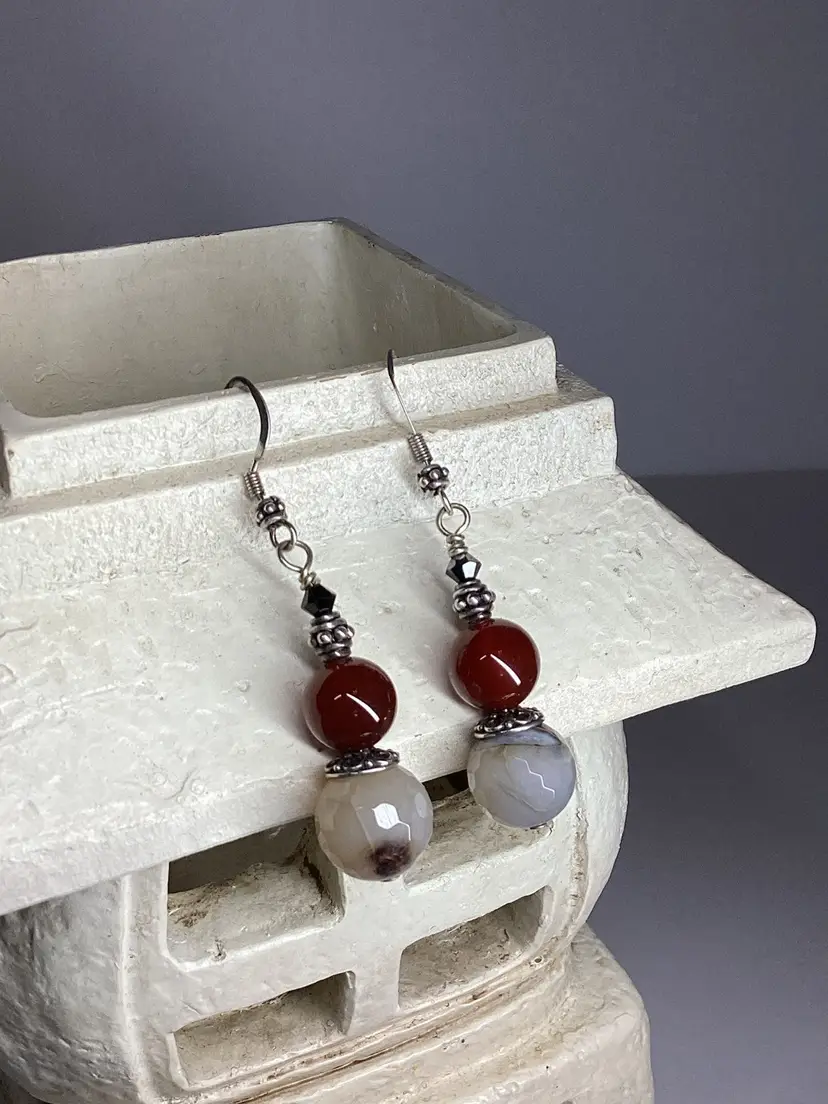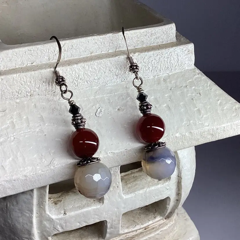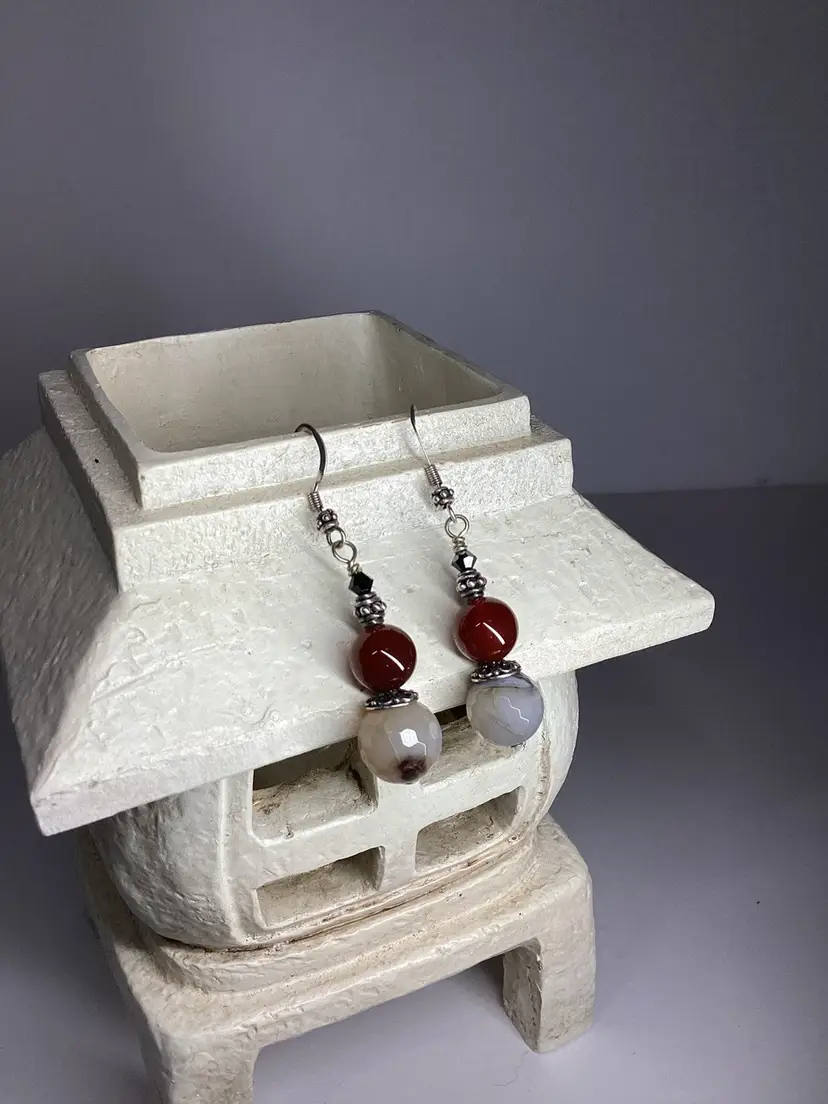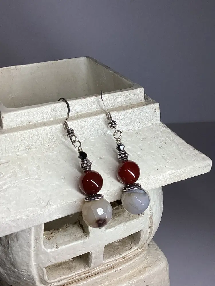 The main attraction on this gorgeous one of a kind pair of earrings is the faceted cracked agate rounds paired with the warm red of carnelian but don’t discount the supporting actors, Swarovski bicones in black and sterling silver spacers secondary feature. Easily worn casually with jeans as with a fancy gown. Each drop is suspended from a sterling silver earring hook. Length is approximately 2.25”. #earrings #handmade #wdesigns #sterling #silver #agate #black #white #ooak #carnelian