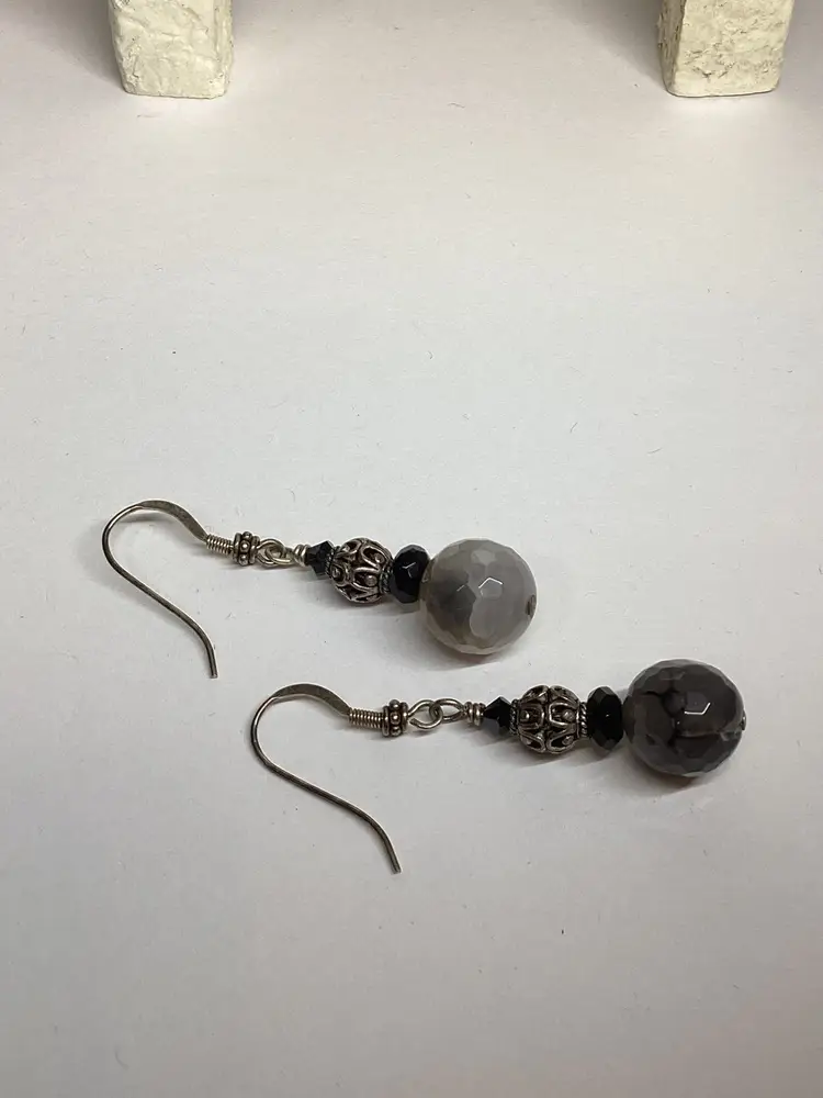 Who knew black and white could be so versatile? The main attraction on this gorgeous one of a kind pair of earrings is the faceted cracked agate rounds but don’t discount the supporting actors, the Czech glass rondelles and Swarovski bicones in black and a beautiful sterling filigree secondary feature. Easily worn casually with jeans as with a fancy gown. Each drop is suspended from a sterling silver earring hook. Length is approximately 2”. #earrings #handmade #wdesigns #sterling #silver #agate #black #white #ooak