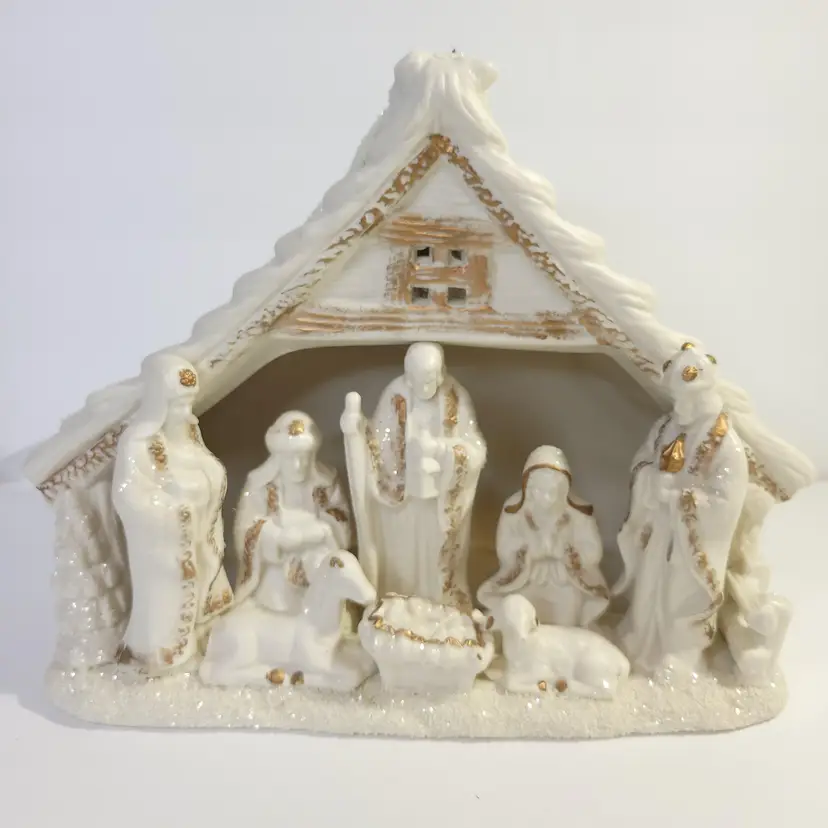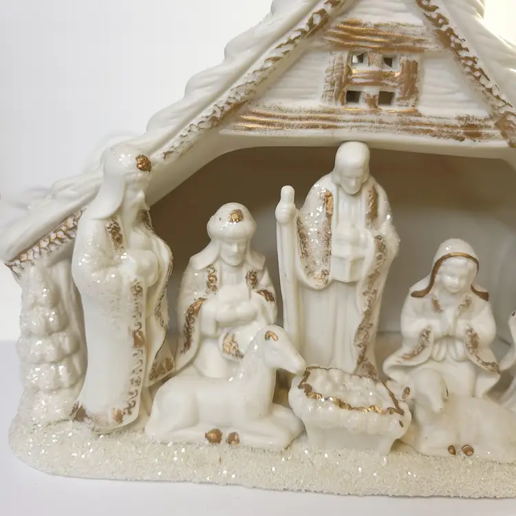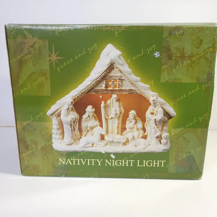 Excellent pre-owned condition Nativity Night Light from Cracker Barrel Country Store Vintage Works! Beautiful white pearlized porcelain with gold-toned accents Features Mary, Joseph, Baby Jesus, Three Wise Men and some animals in the stable Measures approximately 8" tall x 4.5" deep x 10" long