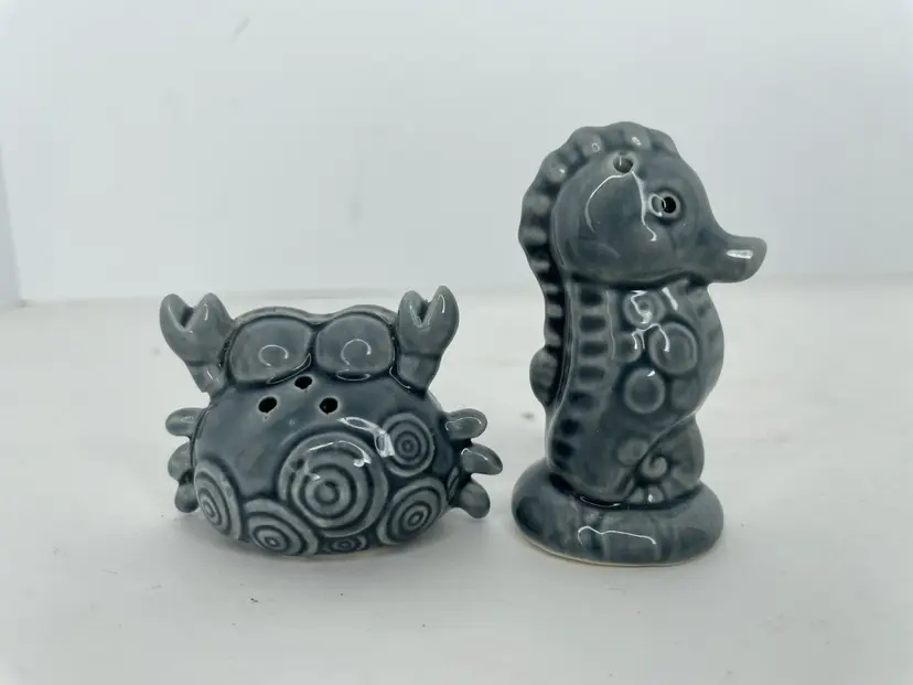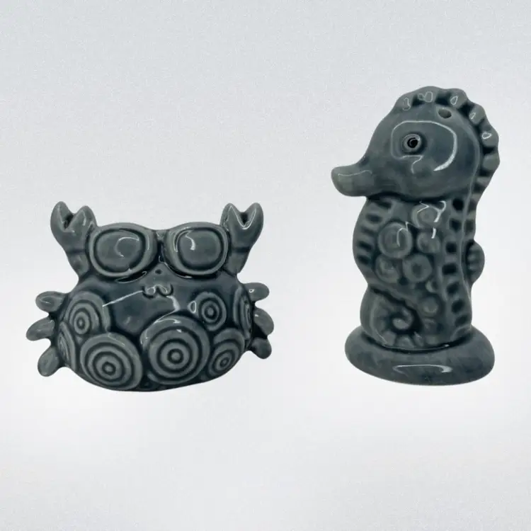 Spice up your kitchen with these charming Cracker Barrel Gray Seahorse and Crab Salt & Pepper Shakers. Perfect for all occasions, this set includes two ceramic animal-shaped shakers that are both functional and decorative.
