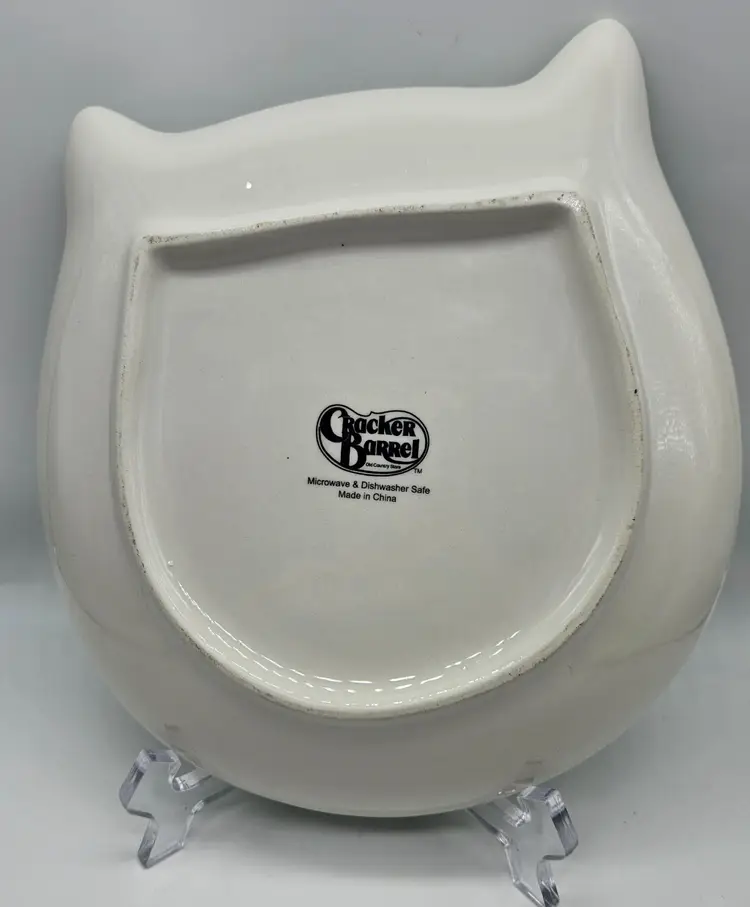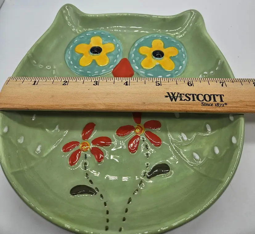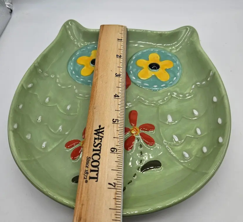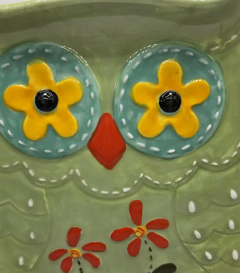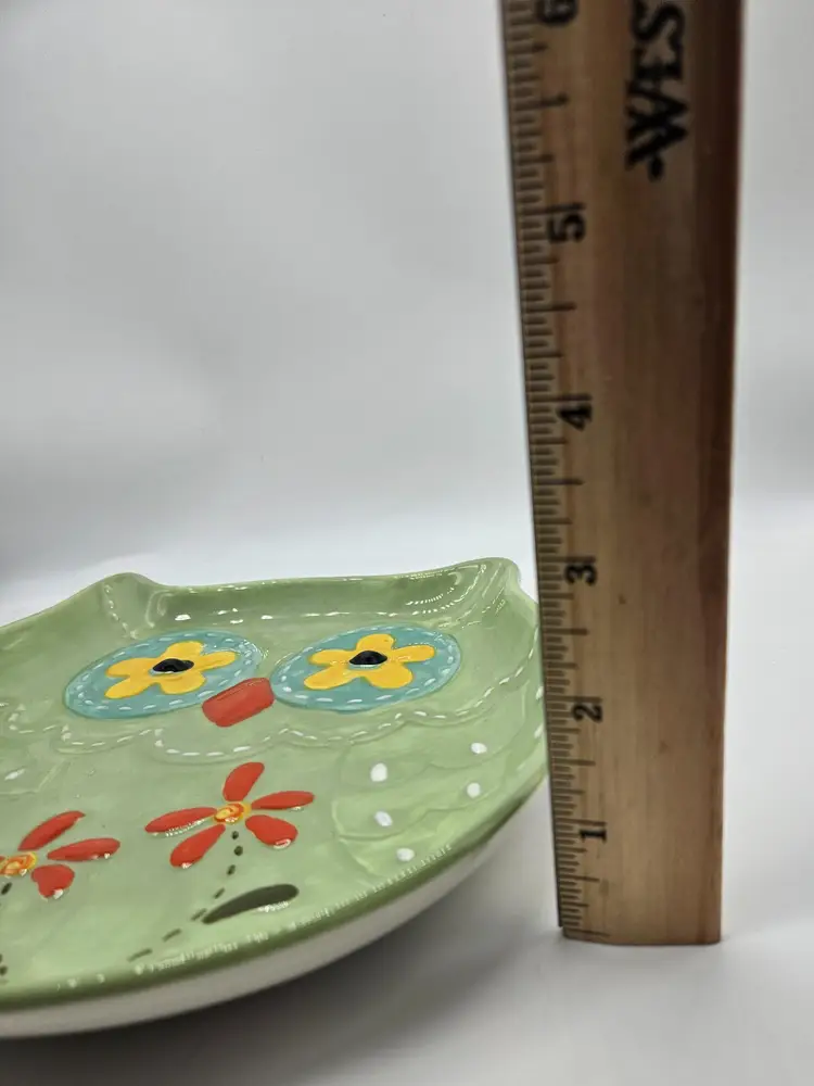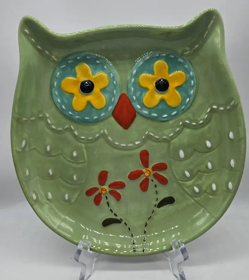 Charming green owl ceramic plate with colorful floral accents. Perfect for adding a whimsical touch to your home decor.