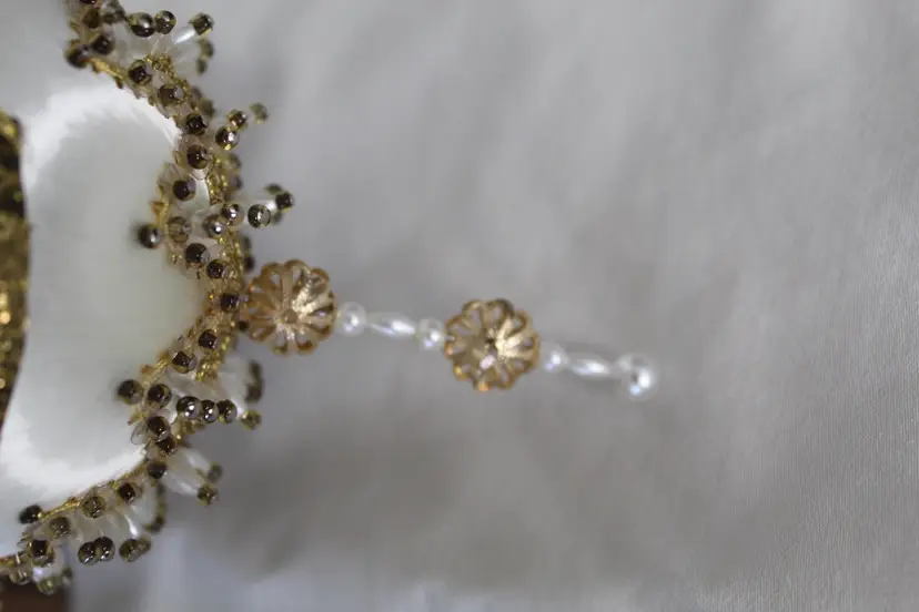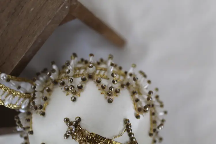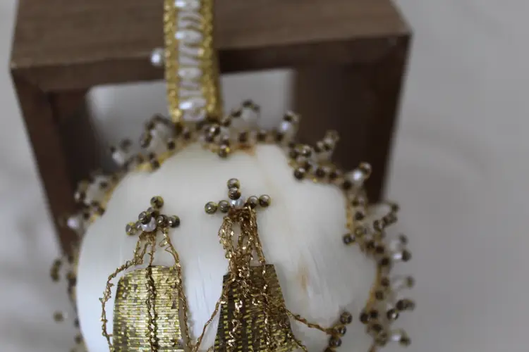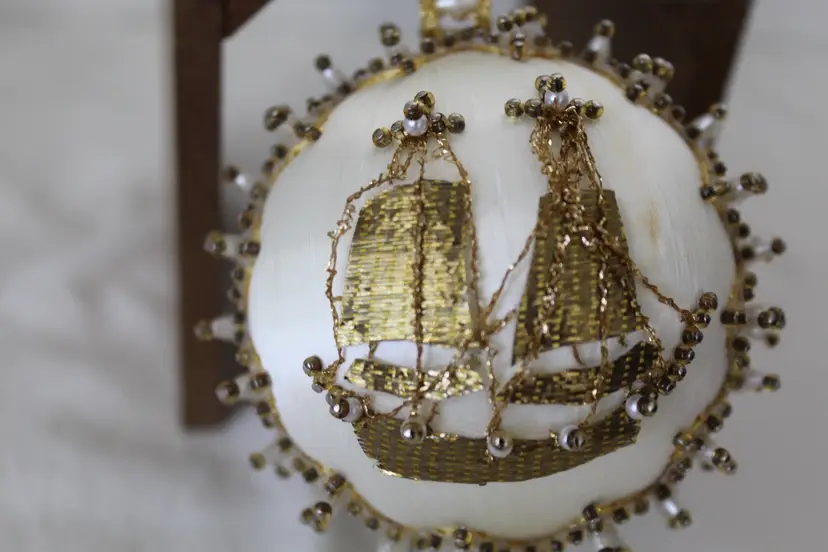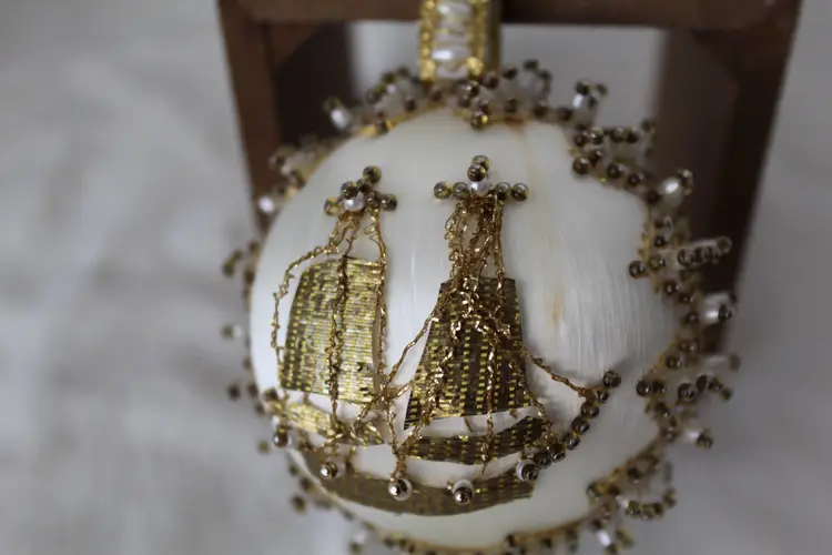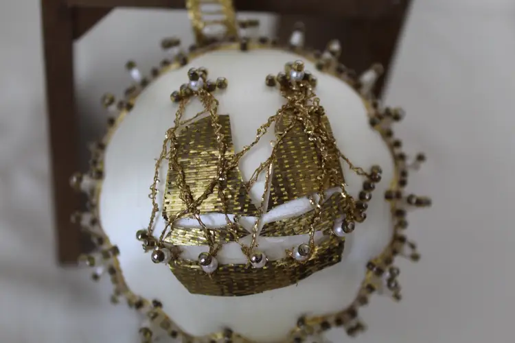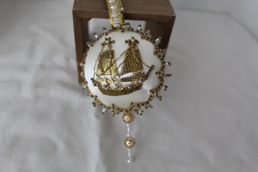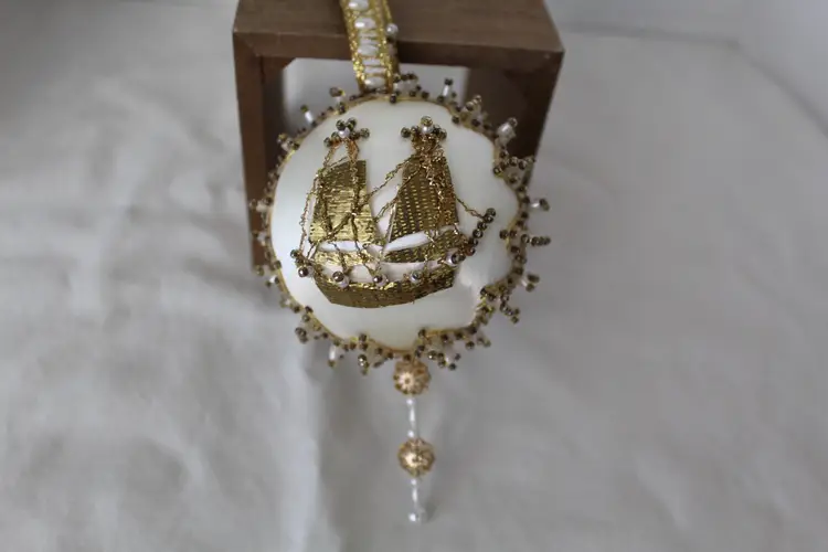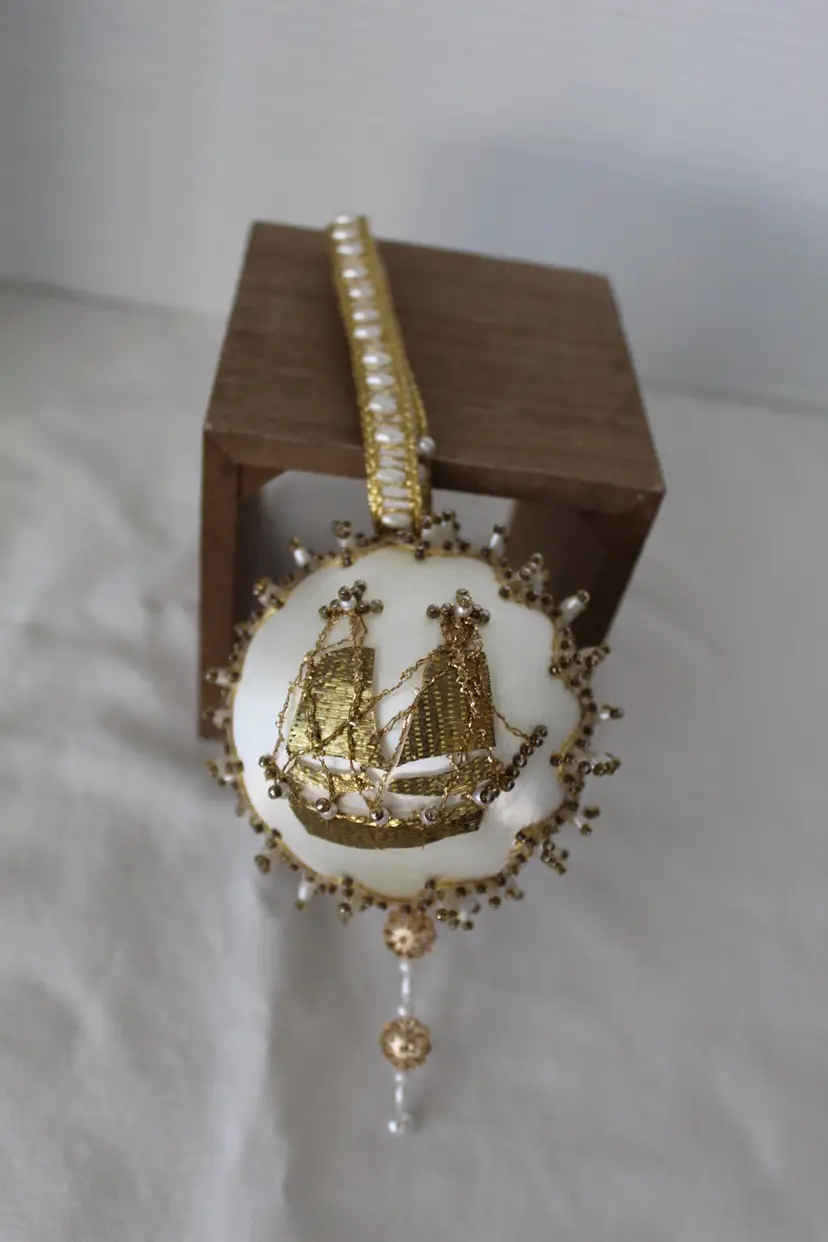 The Cracker Box Inc Vintage Beaded Christmas Ornament Winter Wind features a round shape and a gold color, perfect for adding a touch of vintage charm to your holiday decor. Handmade with mixed materials including satin, this ornament depicts a sailing ship theme with intricate beadwork details. Made in the year 2000 by The Cracker Box, this unique and collectible item measures 8.5 inches in length, 3.25 inches in height, and 3.25 inches in width, weighing 1.5 ounces. Ideal for Christmas enthusiasts who appreciate antique-inspired ornaments with a nautical flair.