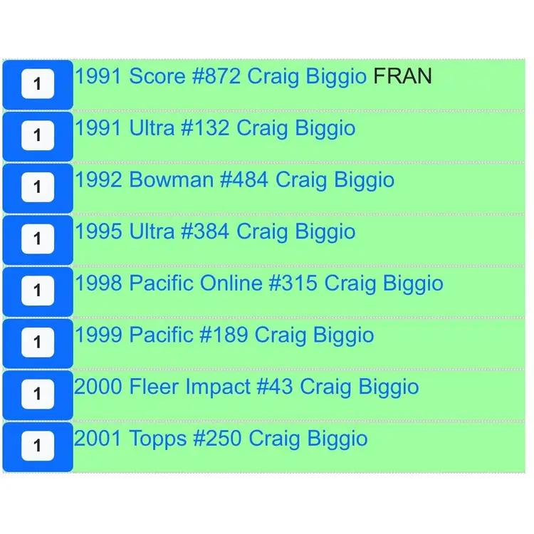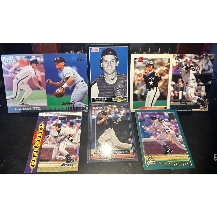 From top left to bottom right: 1991 Fleer Ultra 1995 Fleer Ultra 1991 Score The Franchise 1992 Bowman 1999 Pacific 1998 Pacific Online 2000 Fleer Impact 2001 Topps Flagship