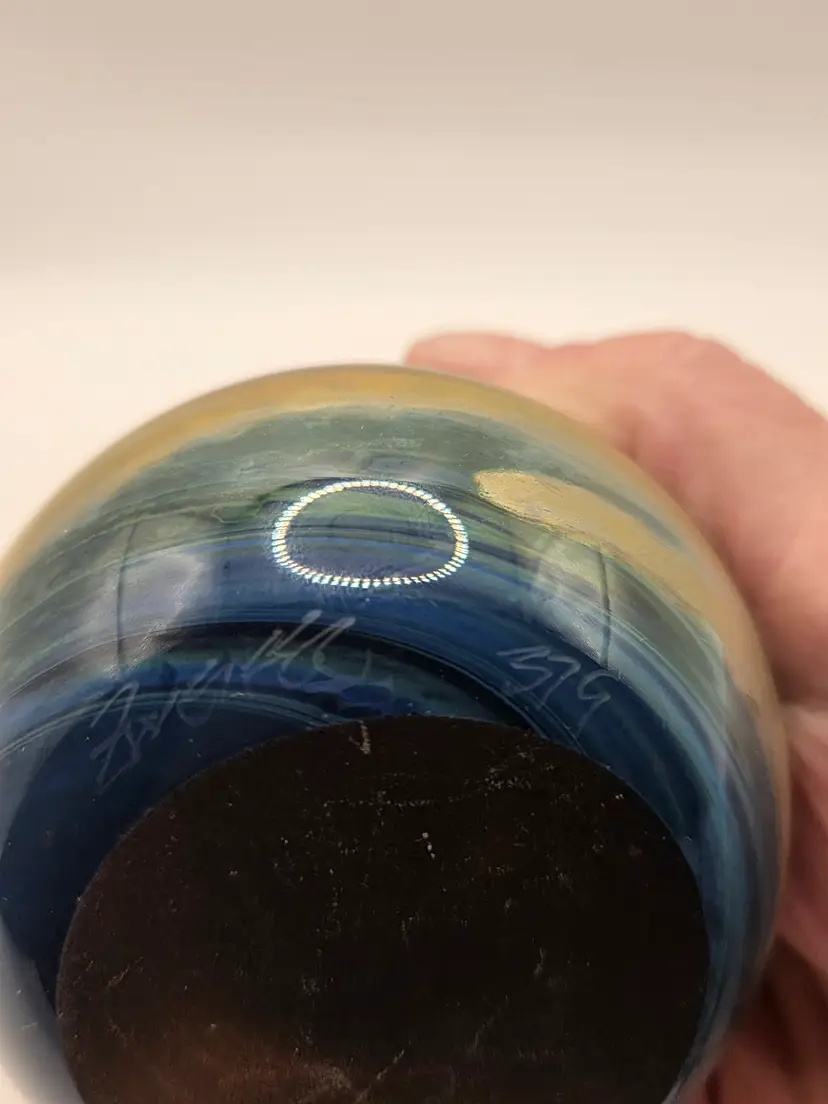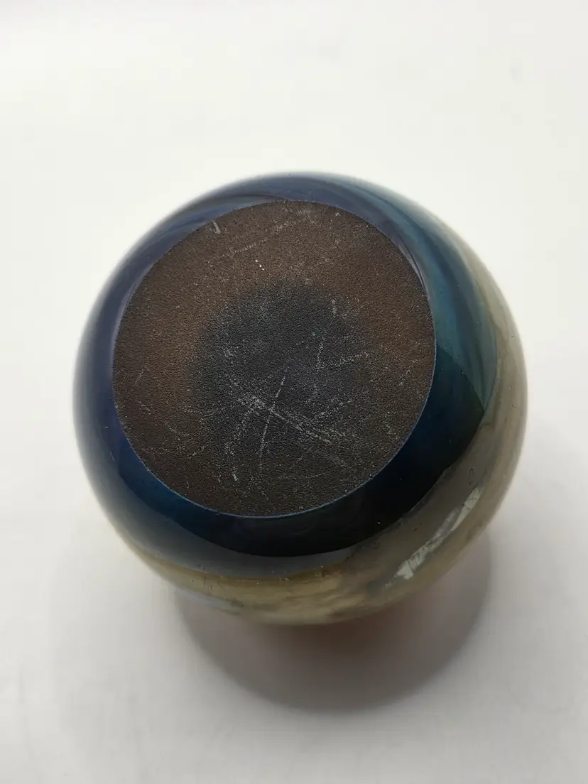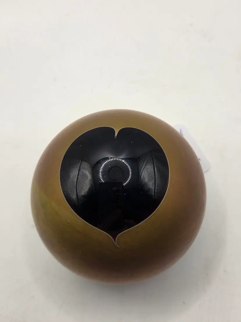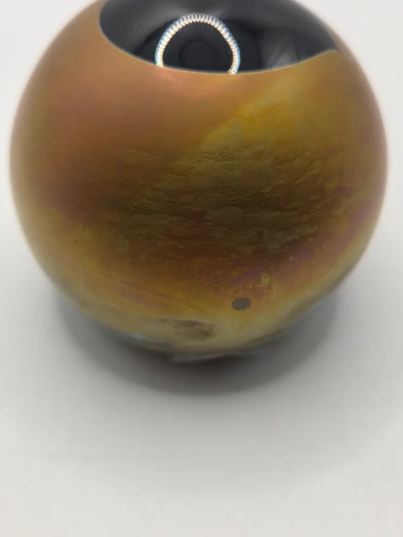 Beautiful Artist-Signed art glass paperweight by Craig Zweifel. Pretty iridescent finish with black heart. 3" round