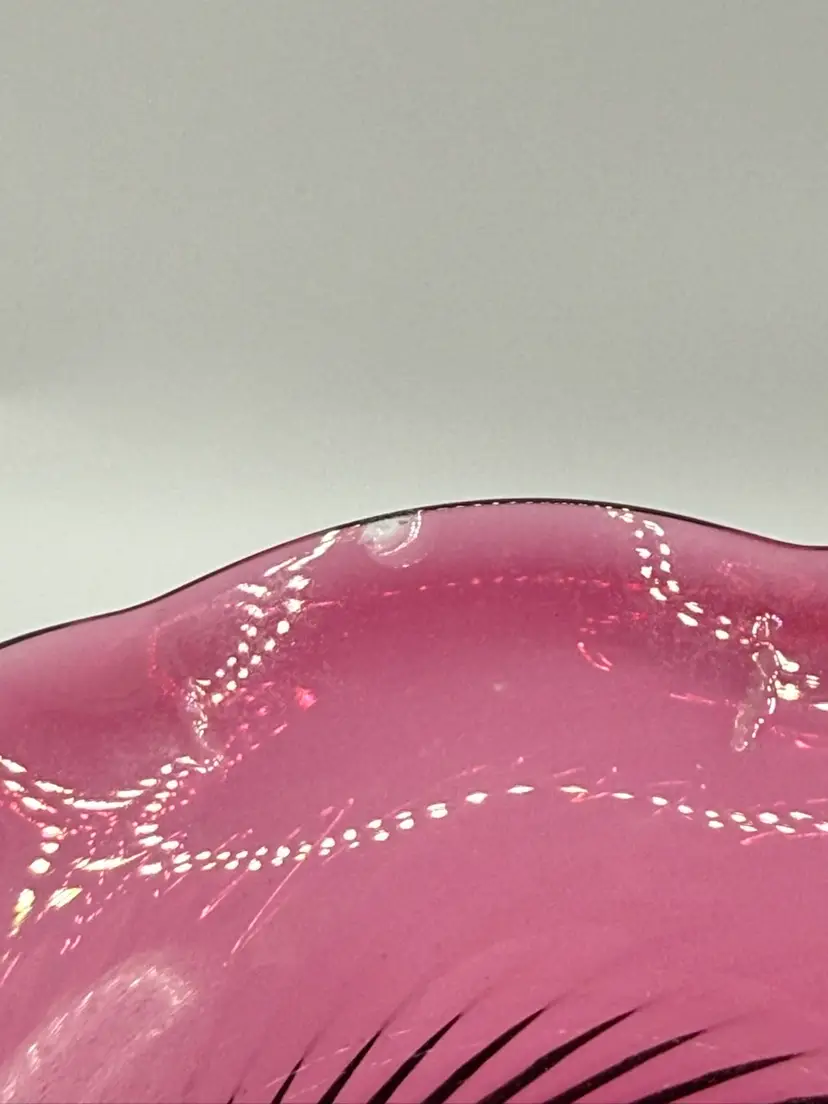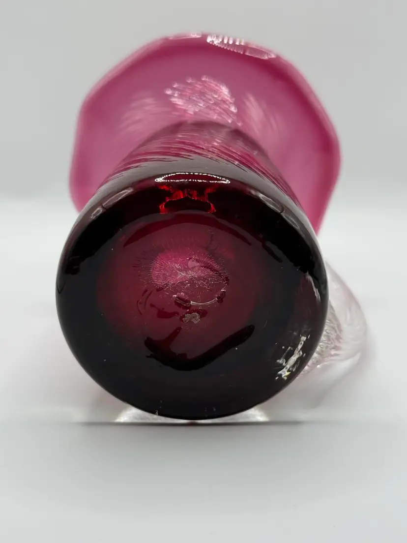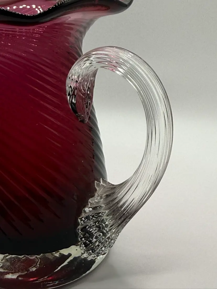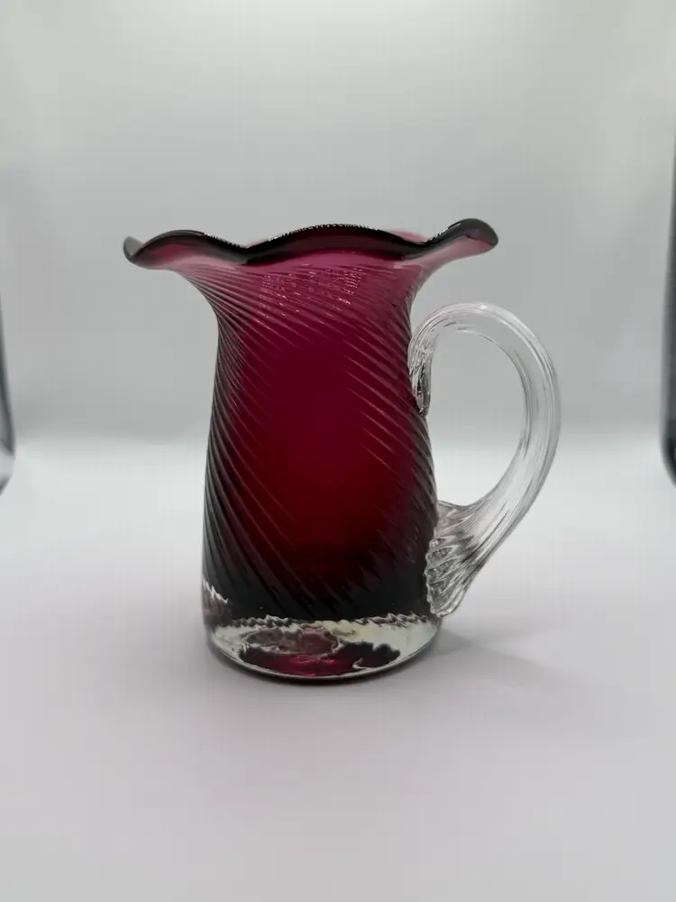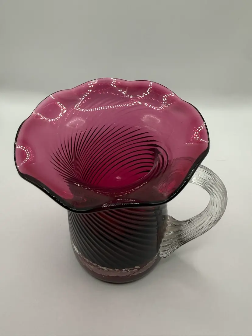Beautiful cranberry colored glass pitcher or bud vase. Features swirl pattern, ruffled rim and clear base. Handle is applied clear glass Flea bite on rim - see picture. 3.5 inches tall and 2.25 inches at base, opening is 3 inches in diameter.