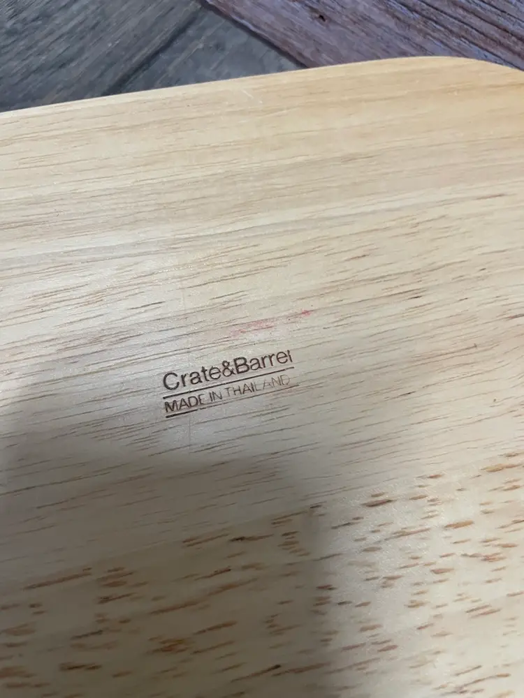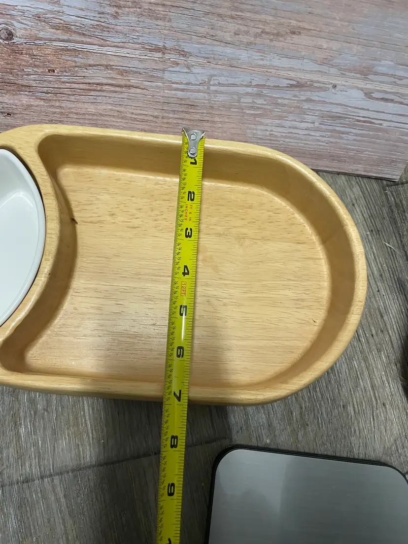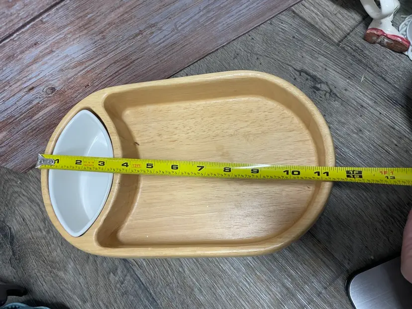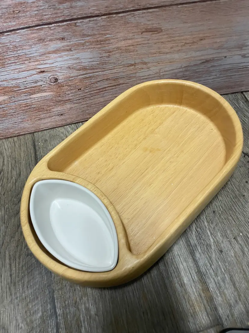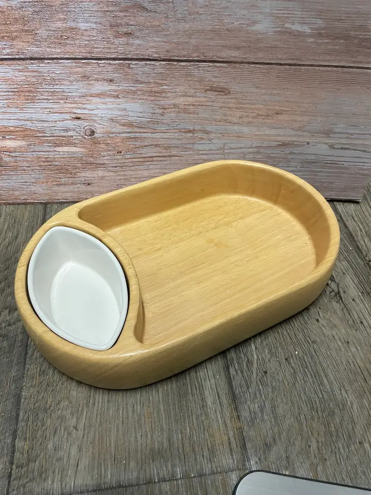 Crate & Barrel wooden chip bowl with ceramic dip bowl. Minor crack in wood as shown in pictures, but does not impair usability. Approximate measurements in pictures.