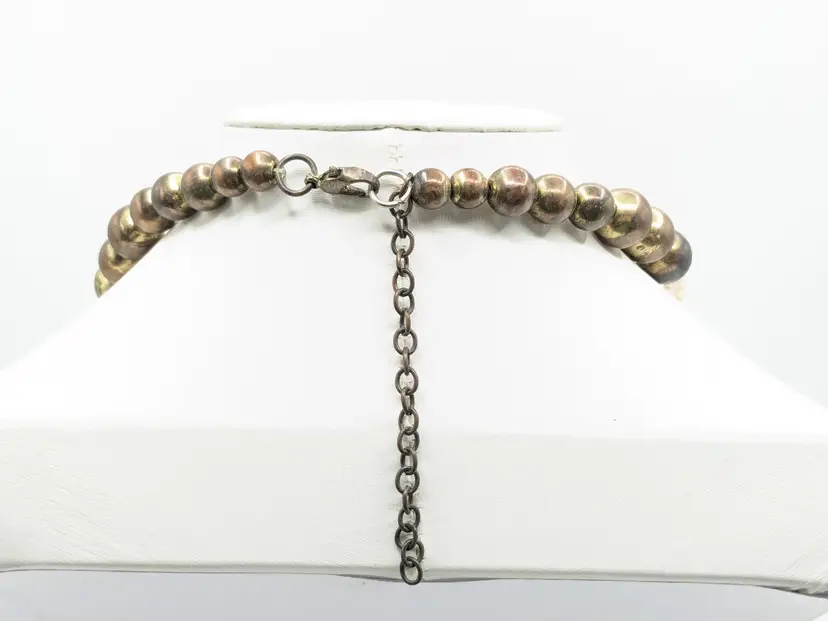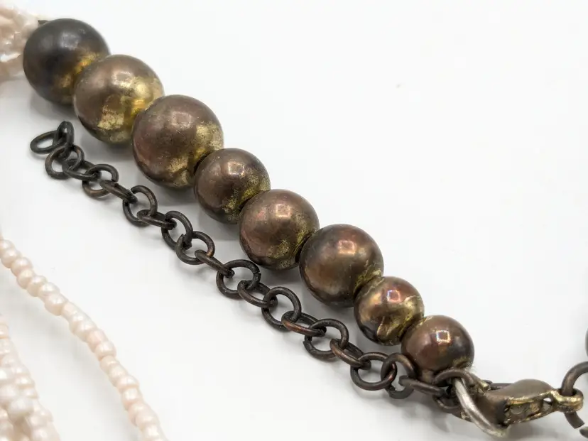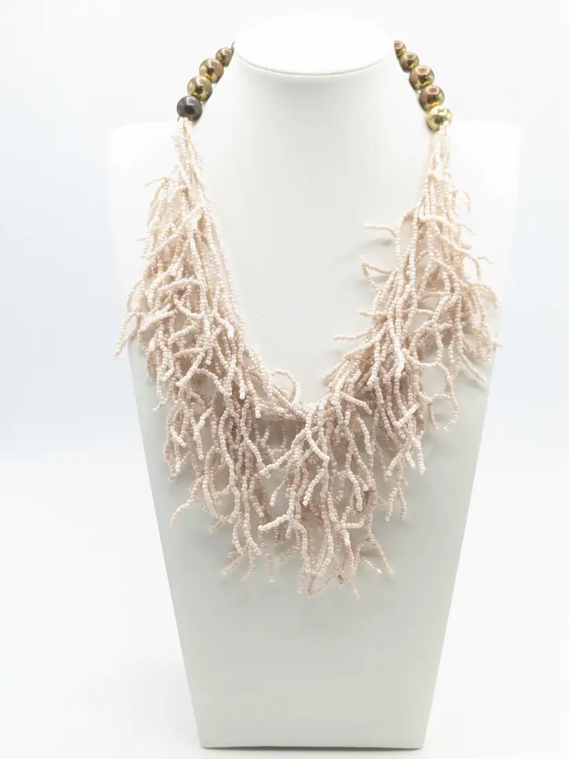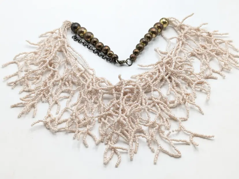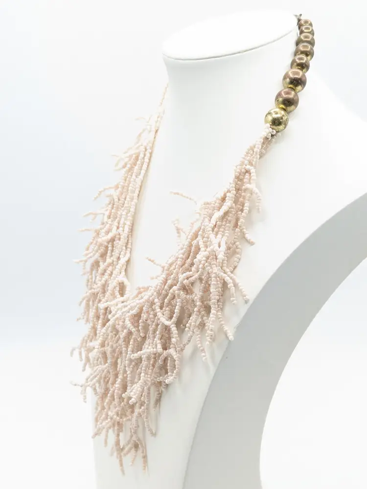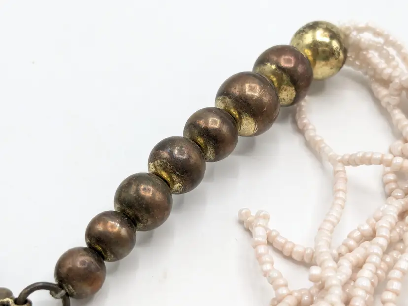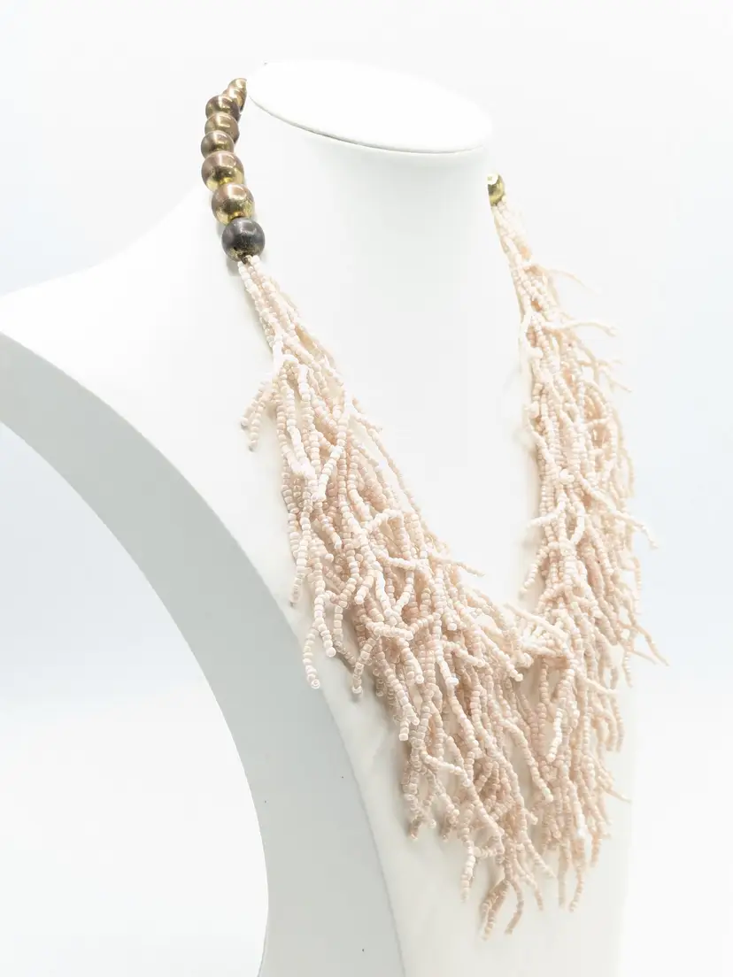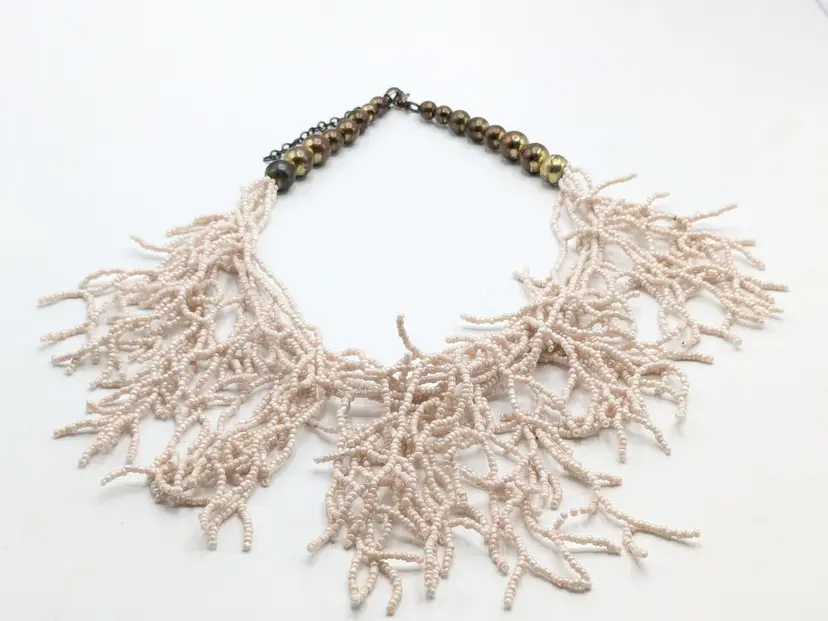 Good condition. READ: Large gold tone beads, clasp and chain are tarnished. Cream color beads with a tinge of light pink. Features intricate beaded fringe. Measures 24" length + 2 1/2" extension. (EN1)