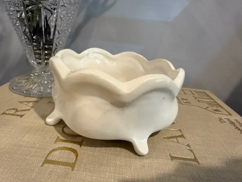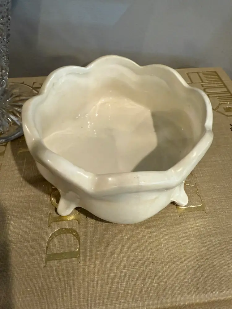 Pottery Bowl, Cream Colored, Footed, Scalloped Edges. This charming basin-style bowl is perfect for adding a touch of vintage elegance to any home decor. Made from quality pottery, it features a beautiful cream hue and distinctive scalloped edges that rest on small feet. Ideal as a decorative centerpiece, a catch-all, or a unique planter.