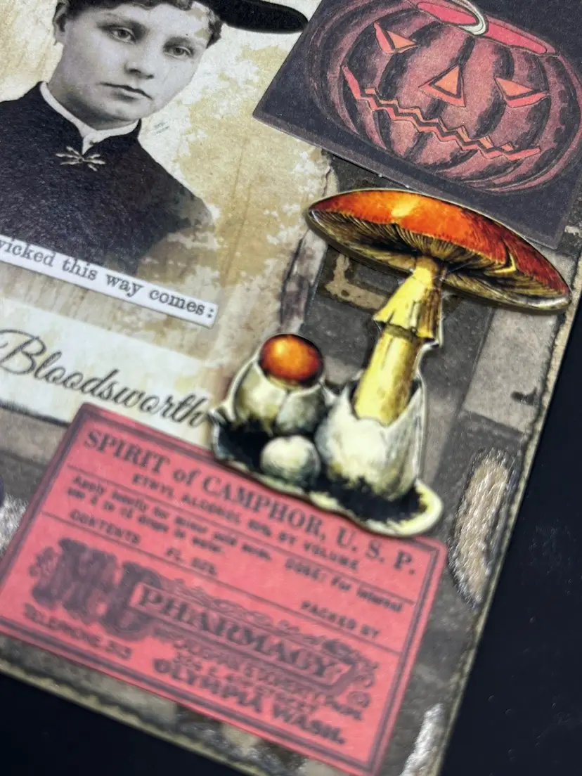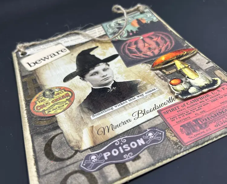 Beware! Something wicked this way comes! Upcycled vintage game card embellished with an assortment of vintage and vintage style papers. One of a kind piece of mixed media art. Measures approximately 5”x 6”. Hangs from jute twine.
