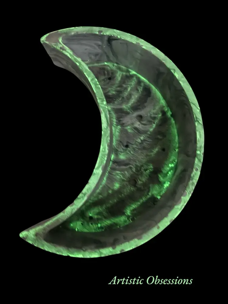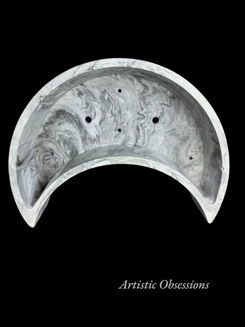 HydroStone crescent moon planter with drainage hole and a hidden secret. This planter not only has some holographic and glittery highlights but it also has some subtle glow in the dark effects! Please note that glow does not last very long, unfortunately. Depth is 2”, inside diameter is approximately 3.25” at widest part. Width is approximately 8” x 4”. Not a symmetrical piece. HydroStone is a porous medium. This pot will be sealed with a non toxic penetrating, water based sealant prior to shipping. This improves and increases water resistance, but it is NOT water proof. Minor imperfections, such as small marks from bubbles, may be present but do not deter from the beauty or functionality of the pot. Each piece is one-of-a-kind and made to last. Indoor use: Wipe gently with a soft, damp cloth, no harsh abrasives or cleaners. Avoid standing water for prolonged periods. Resealing every 12-18 months can be done if desired. Over time, there may be subtle changes in the finish due to natural aging and environmental elements. Outdoor use: Bring indoors during freezing weather to protect from possible cracking. Reapply a breathable sealant approximately every 6-12 months. Expect some element of gentle weathering of finish.