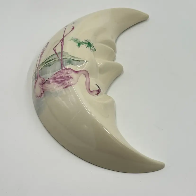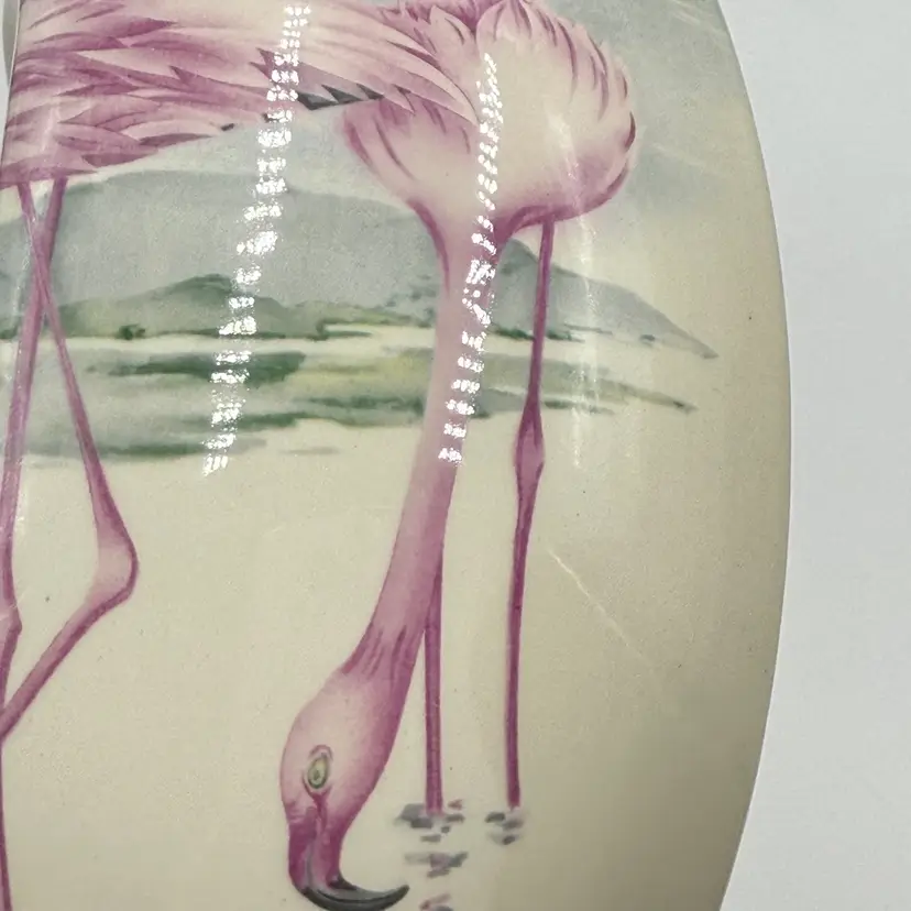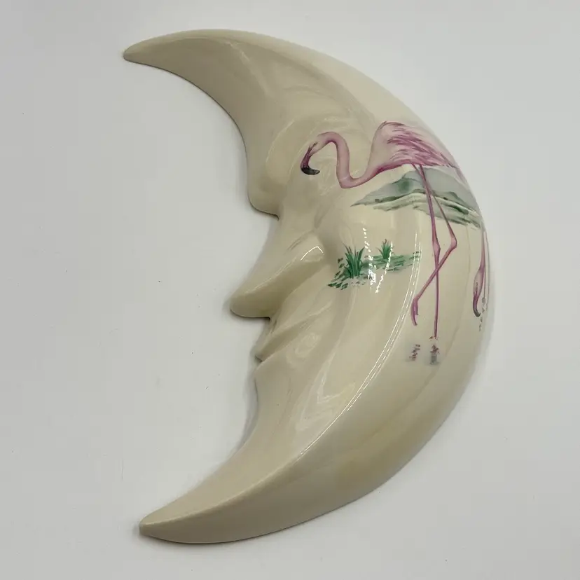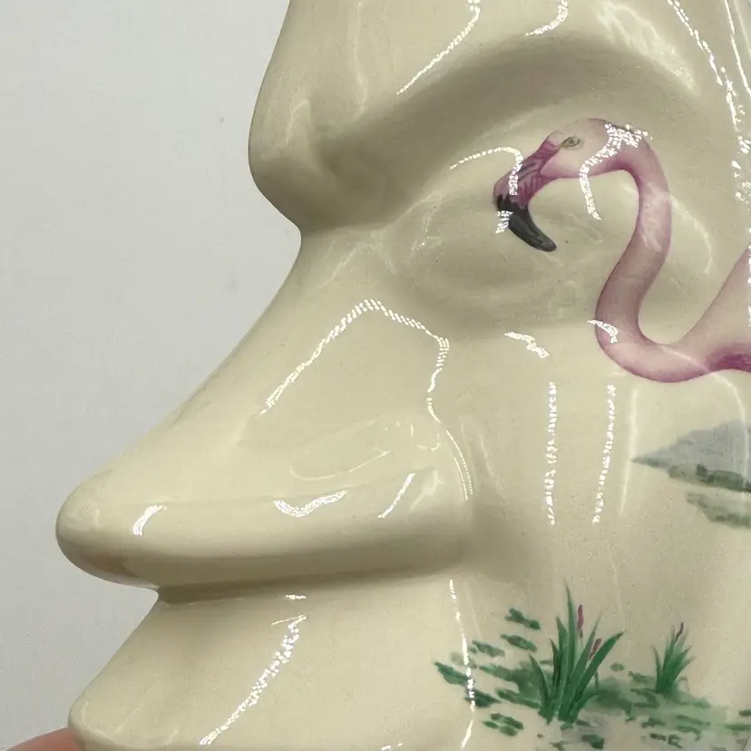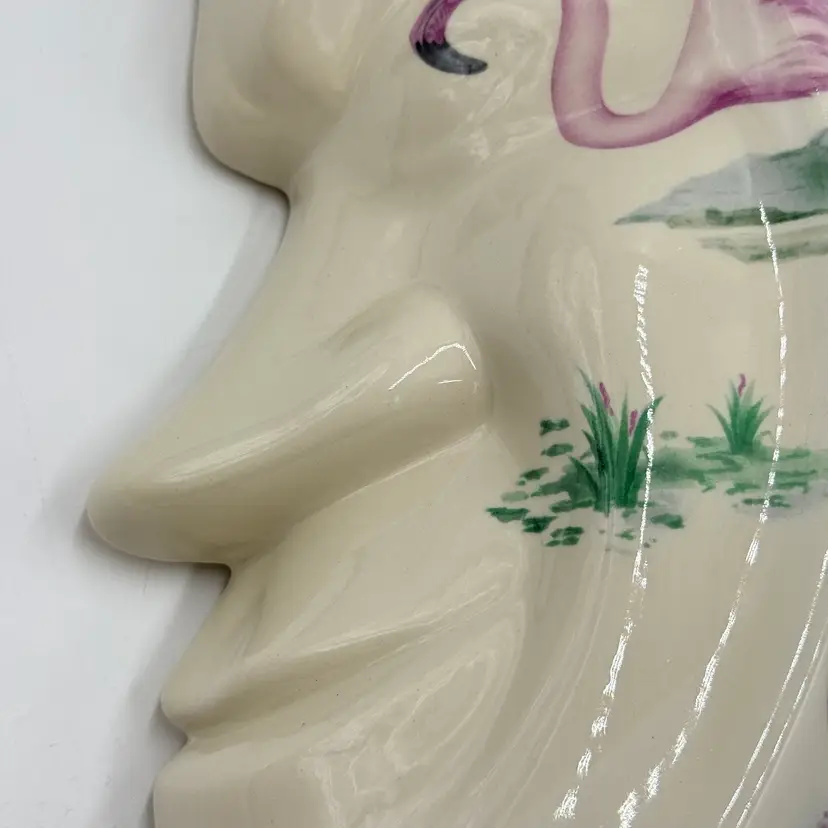In good condition. Does not have any chips or cracks. Hand painted two pink flamingos by a beach or lake. Unique and hard to find wall decoration. Measures 11 1/2 inches tall and 8 inches wide.