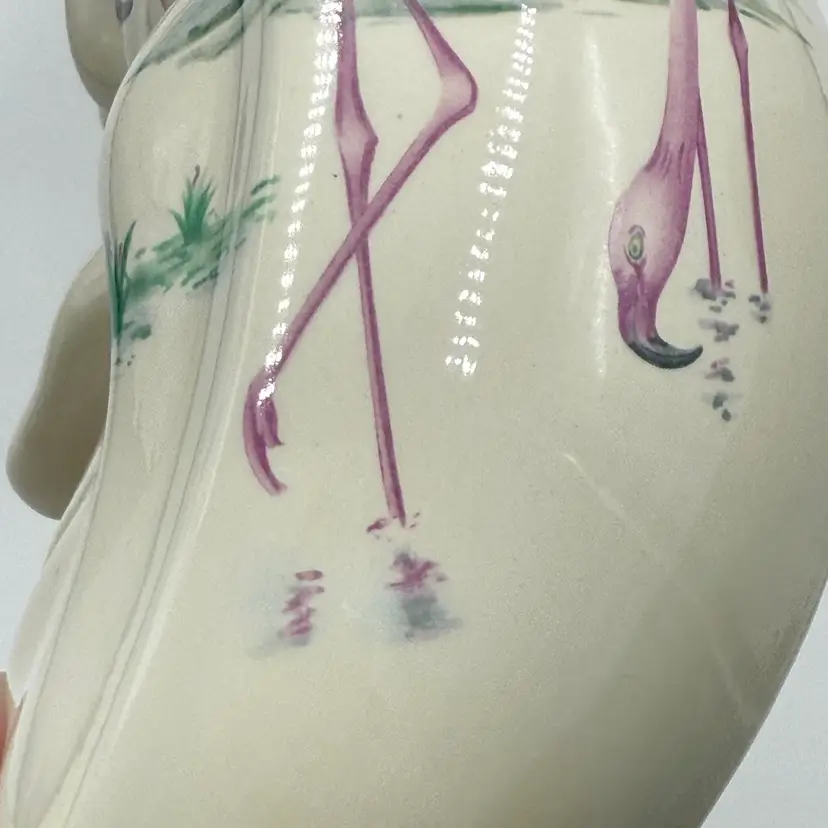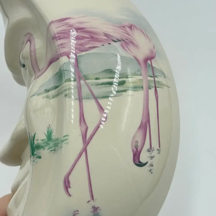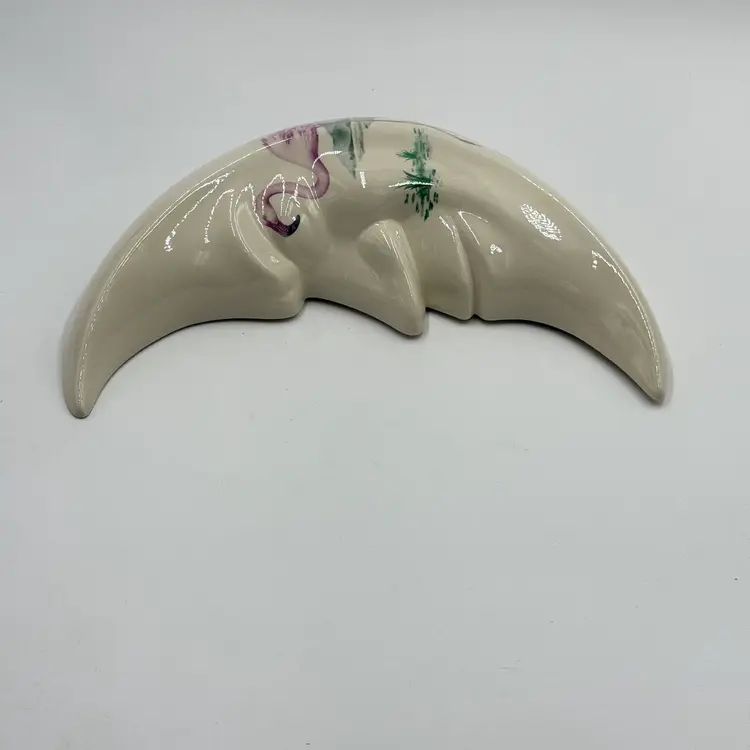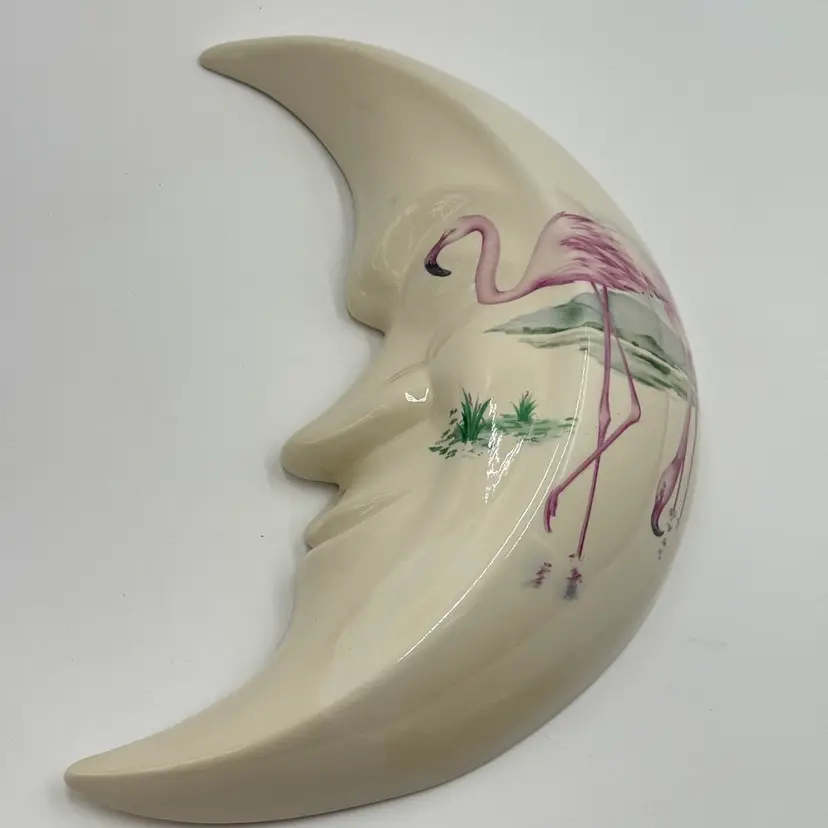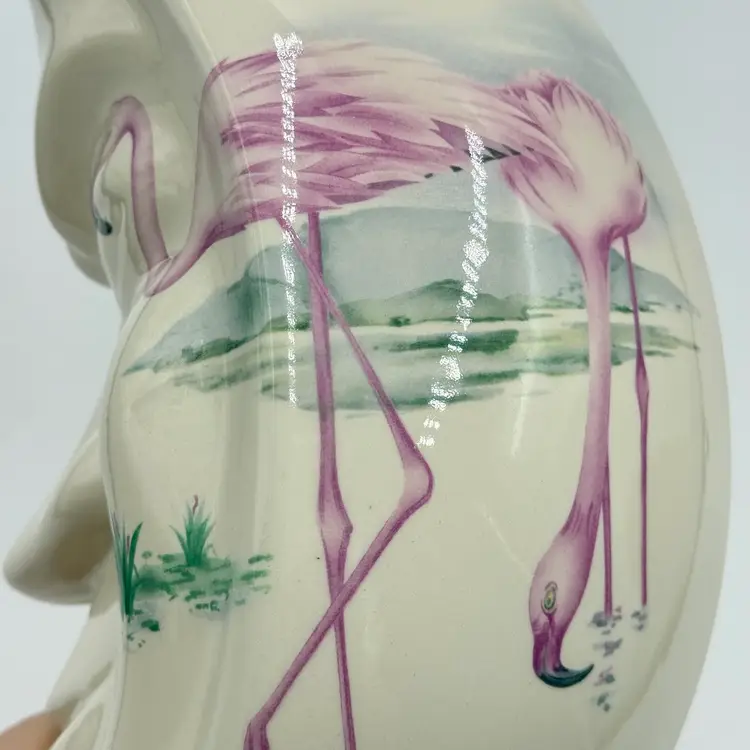 In good condition. Does not have any chips or cracks. Hand painted two pink flamingos by a beach or lake. Unique and hard to find wall decoration. Measures 11 1/2 inches tall and 8 inches wide.