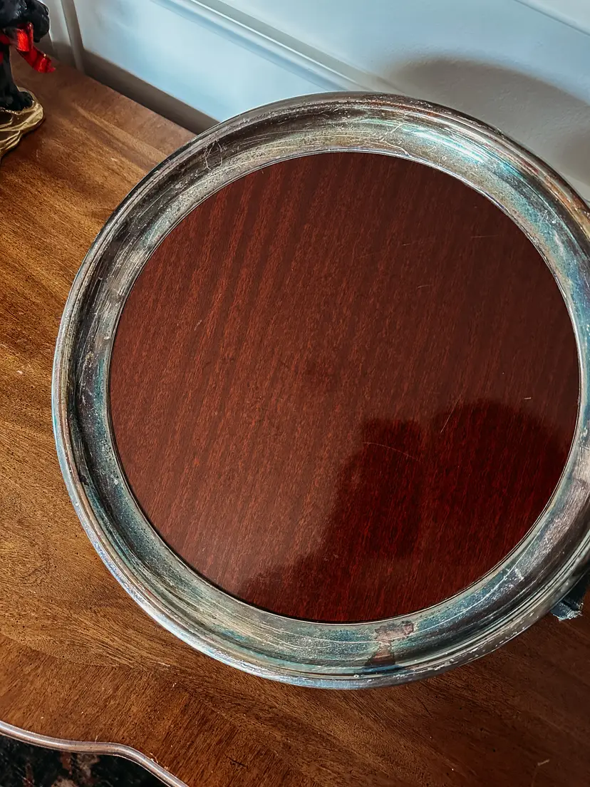 What a great find! This fabulous mid century serving tray by Crescent features a Formica wood grain center rimmed with a silver plate edge. The tray is large ... 16 inches in diameter. It would be a perfect addition to any mid century bar or beverage station with the waterproof Formica top. Serve cocktails or display various liquor bottles on a table or cart. Or, use for serving at meals and banquets. It's large size can accommodate many serving dishes, cups, or other dining necessities. Think of using it for a striking cookie or dessert display. This tray is elegant but extremely functional.