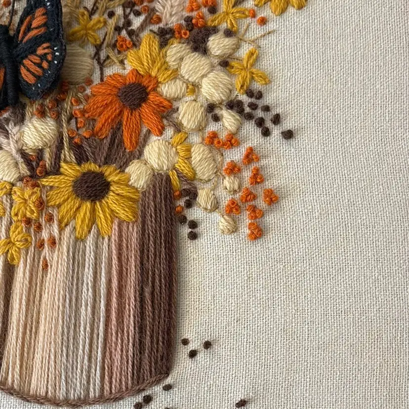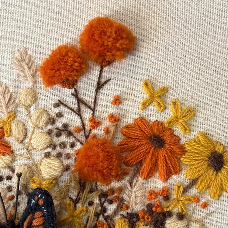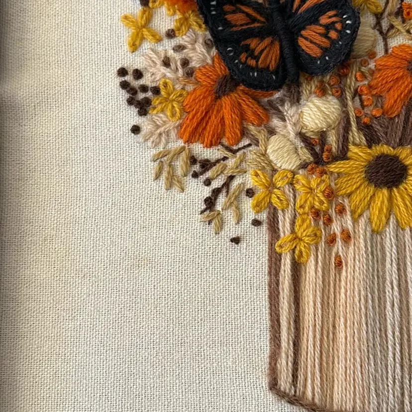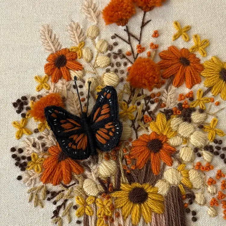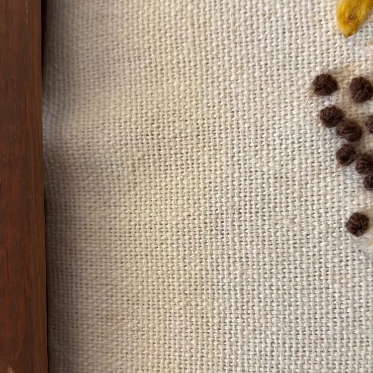 I love this so much. It’s well done and is a beautiful mix of fall colors including a monarch butterfly 19 x 15 frame Has enough space to reframe if you wanted Call out on side where on nail is lifting canvas up. Canvas is not damaged but has gotten hooked on a side nail in the frame