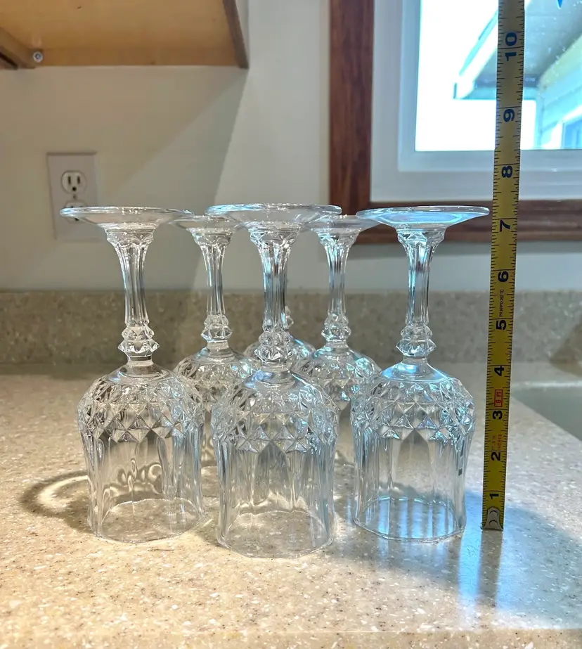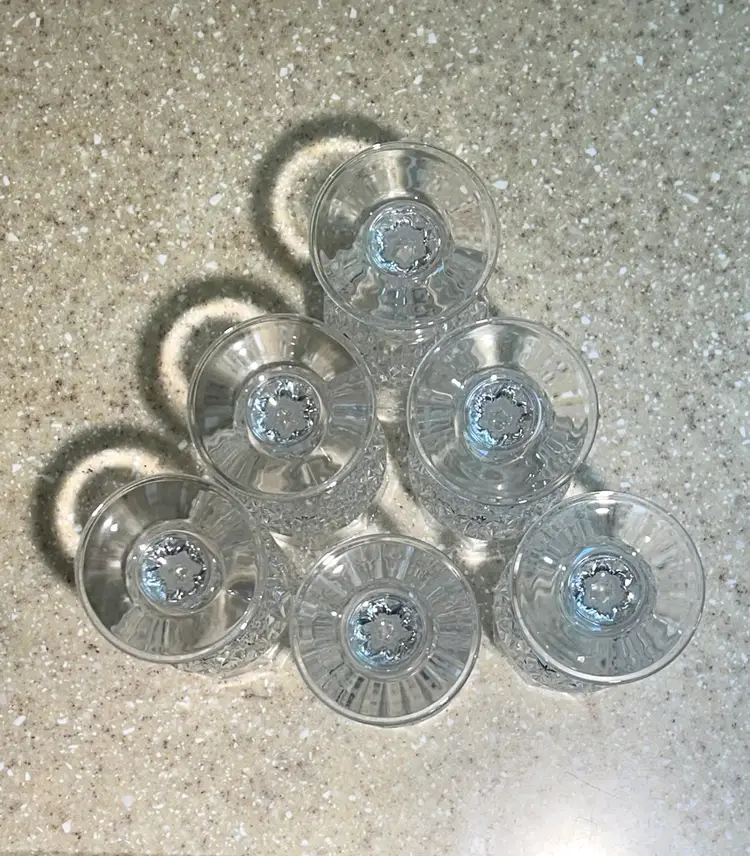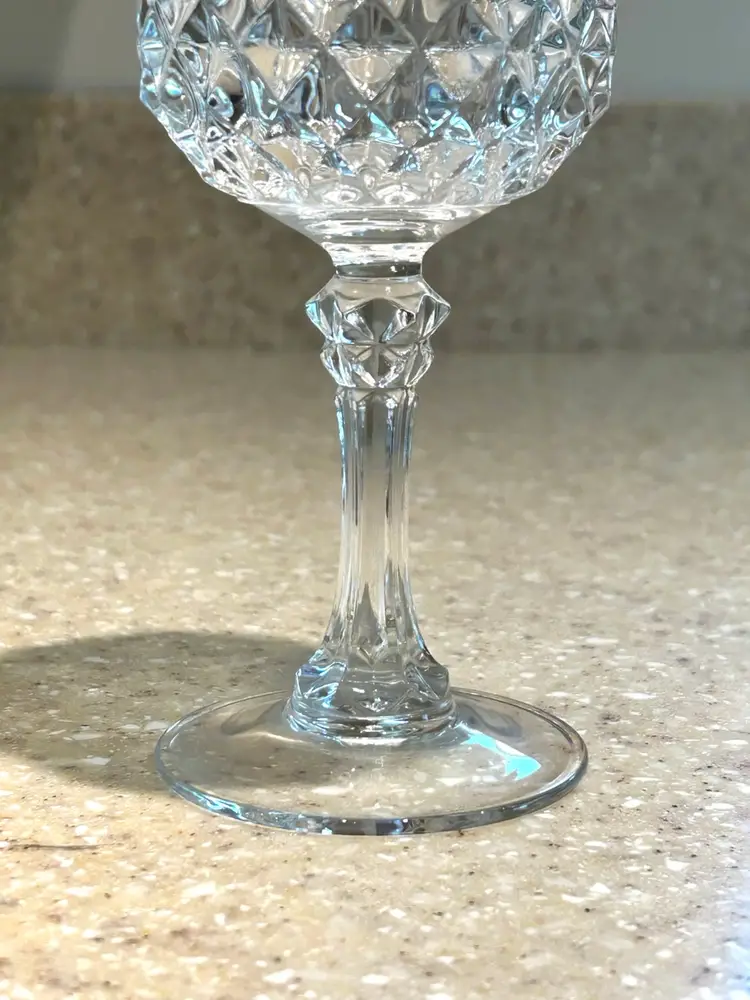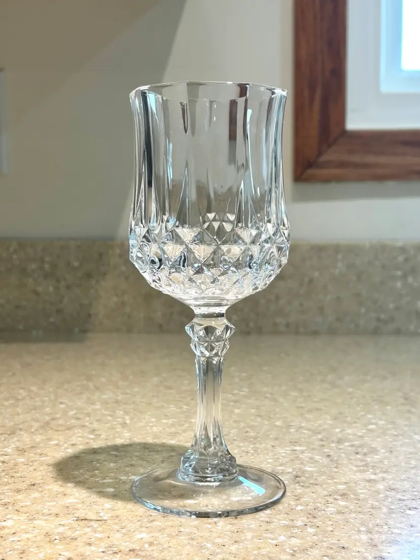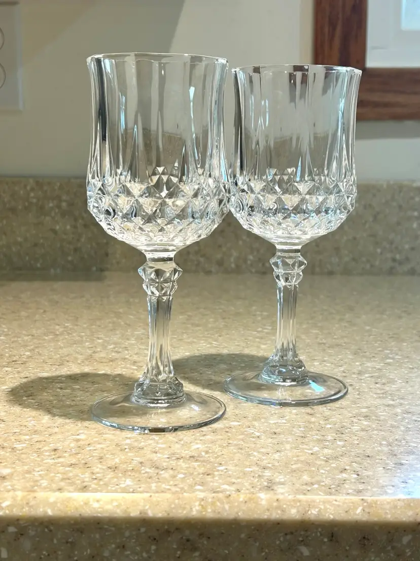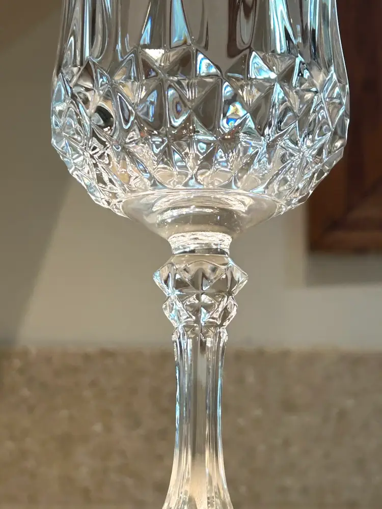 Beautiful and timeless Longchamp diamond-cut, cross-hatch design. Set of 6. 7.25” * 6oz Water Goblets Wine Goblets EXCELLENT condition with no chips or cracks or signs of use. Smoke/Pet free home. *browse my collection of other Cristal d'Arques-Durand Longchamp glasses including SIX each. 5.5” & 6.5” glasses.