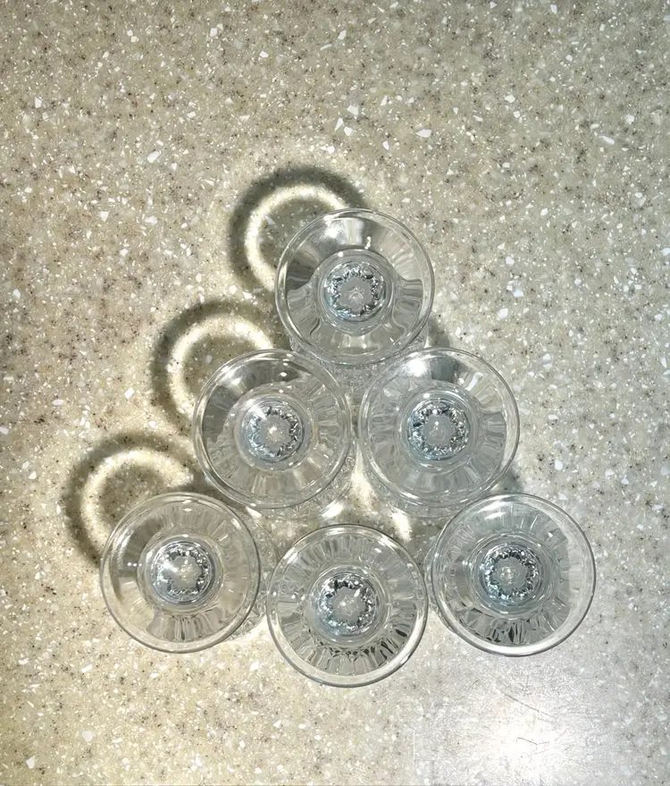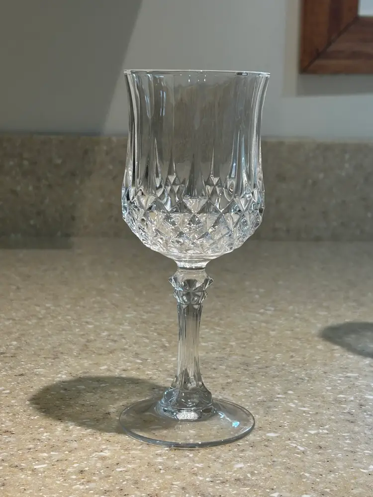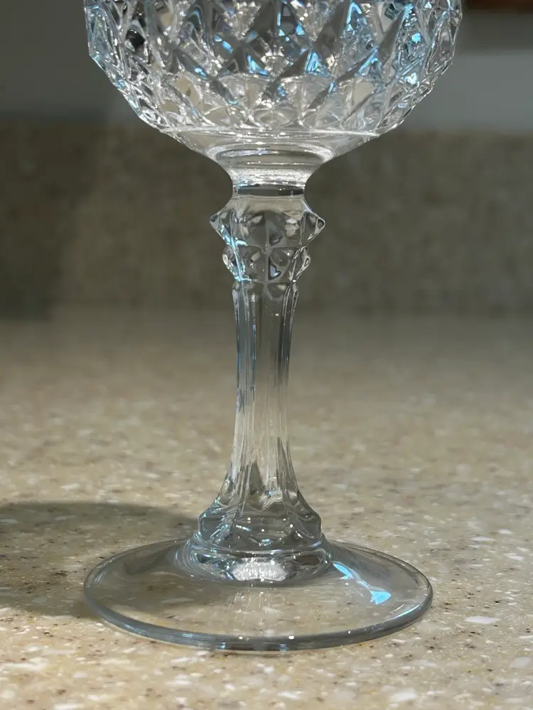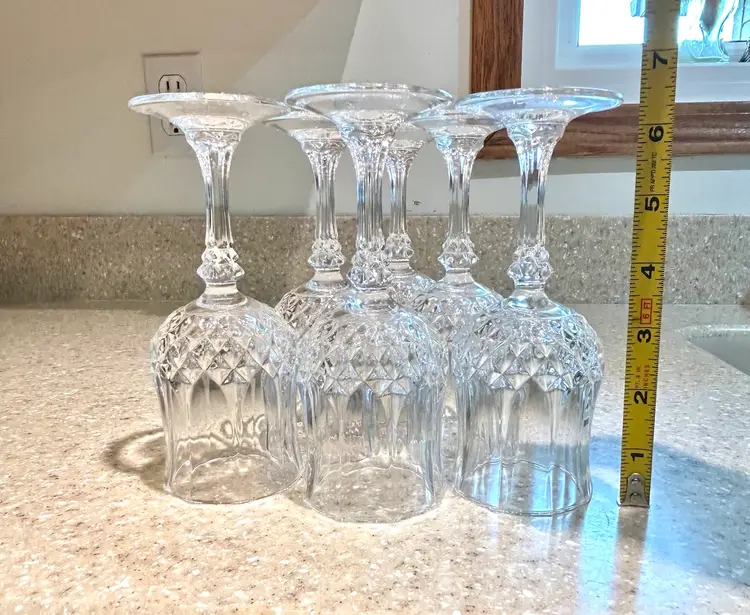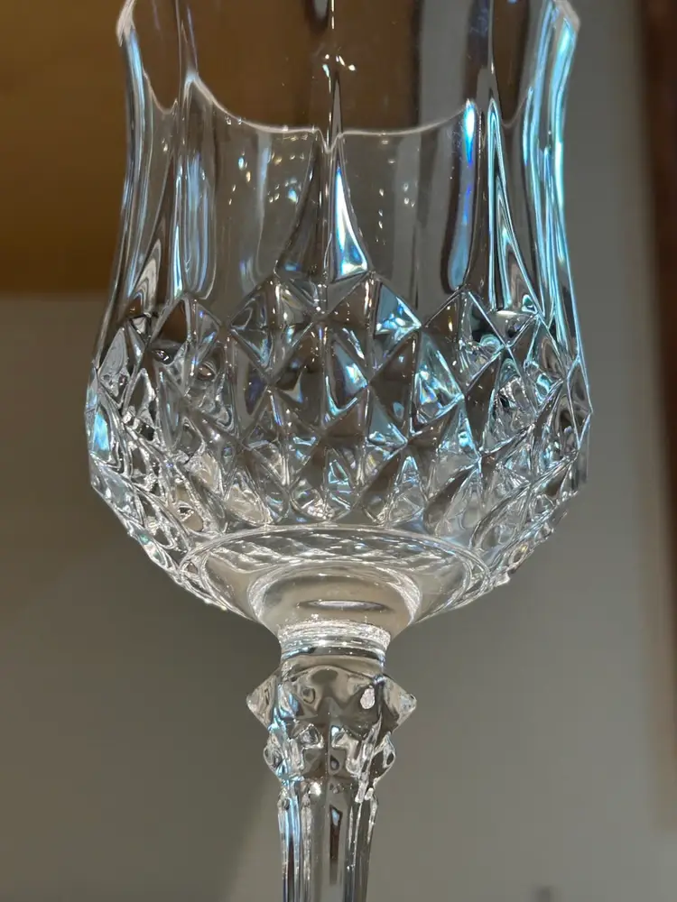 Beautiful and timeless Longchamp diamond-cut, cross-hatch design. Set of 6. 6 1/2" * 4oz Water Goblets Tall Wine EXCELLENT condition with no chips or cracks or signs of use. Smoke/Pet free home. *browse my collection of other Cristal d'Arques-Durand Longchamp glasses including SIX each. 5.5” & 7” glasses.