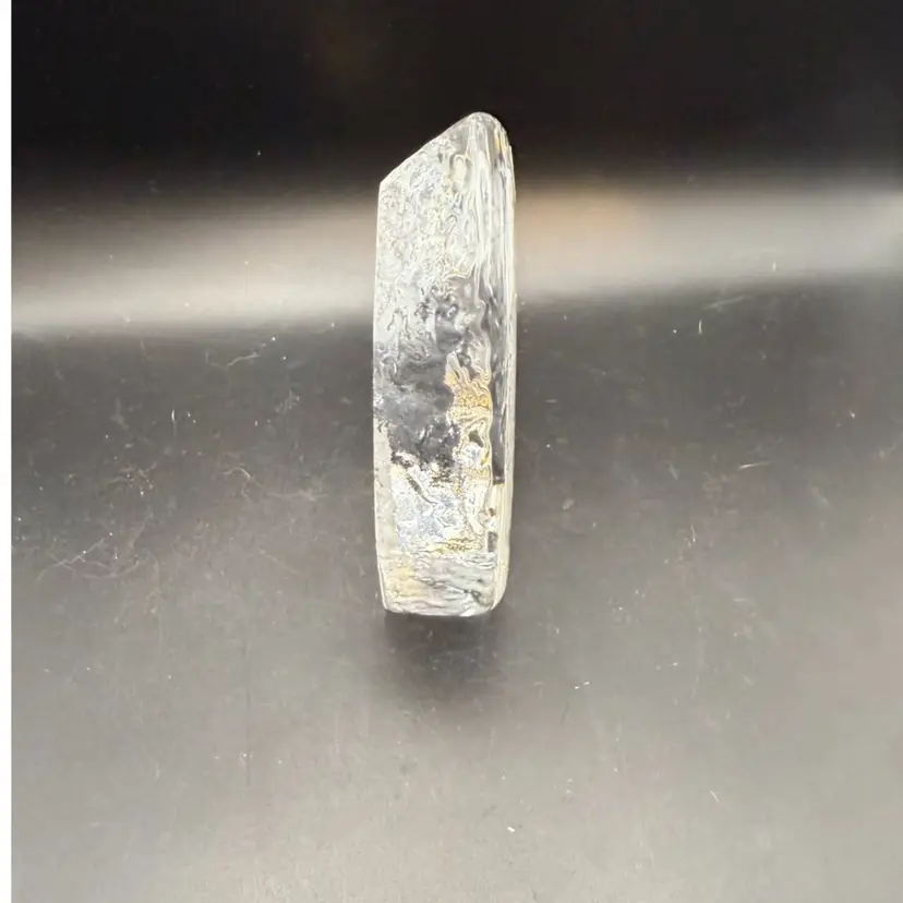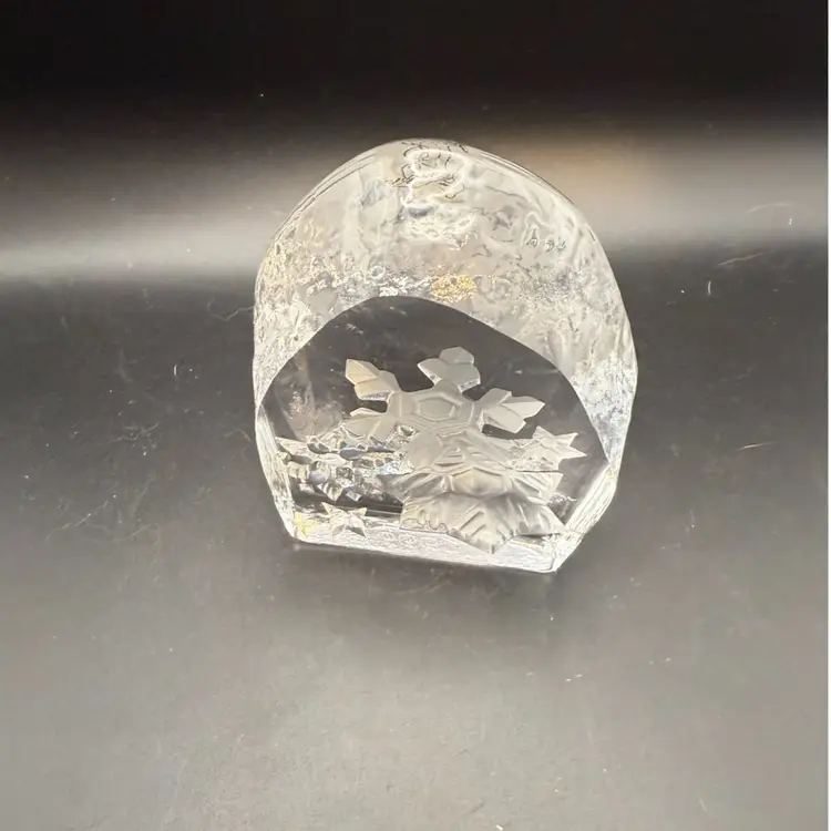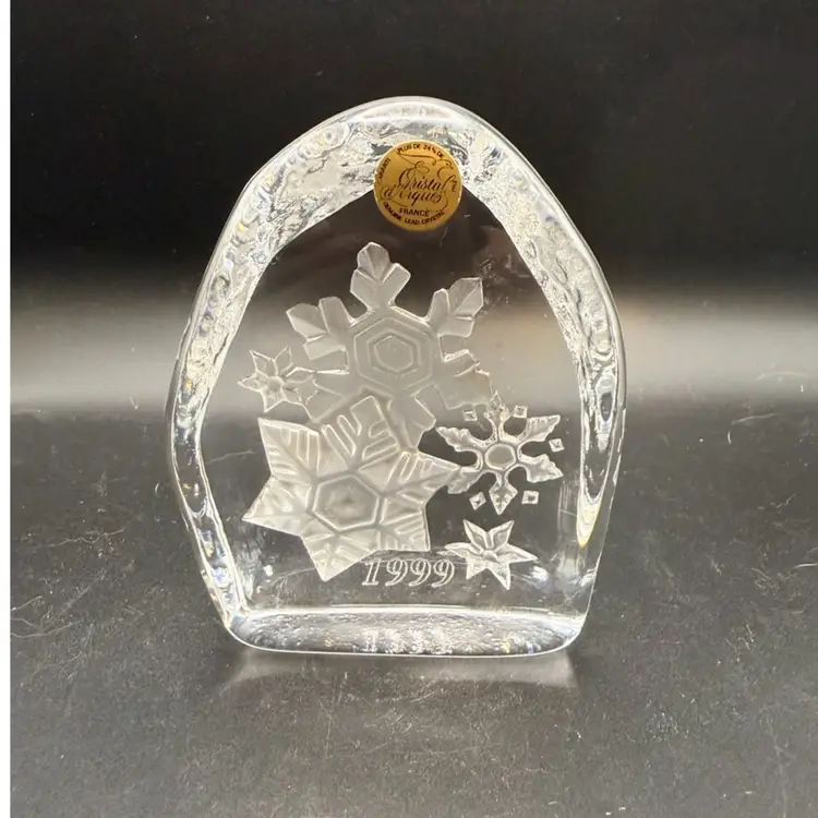 It's a handmade decorative collectible made in France, featuring a snowflake design crafted from clear 24% lead crystal. This paperweight typically measures around 4.5 inches and weighs about 1.6 lbs.