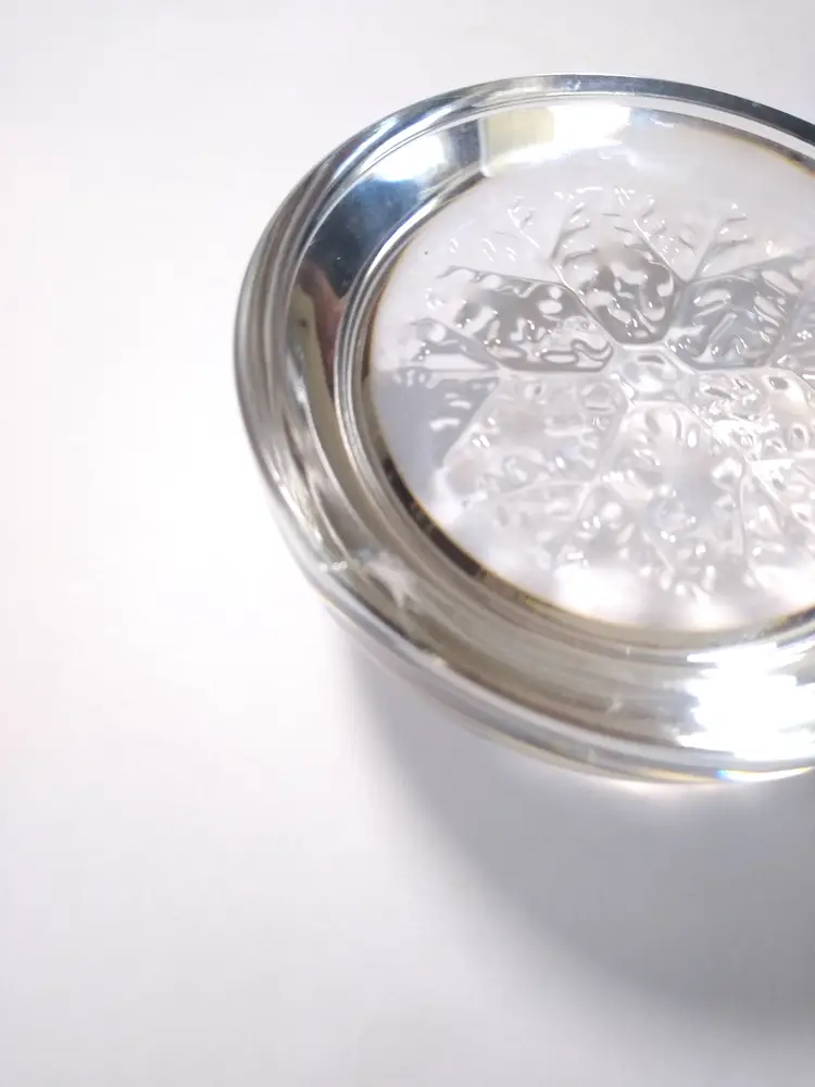It has a Cristal sticker on the side and there is one small split near the base (about 1cm long) which is not visible from the side/top.