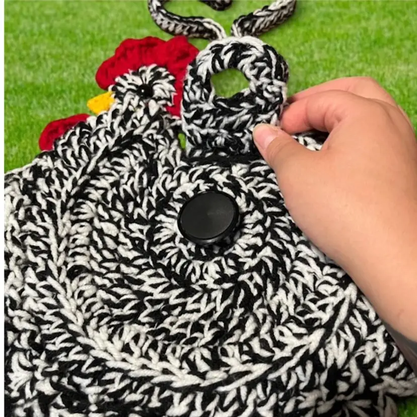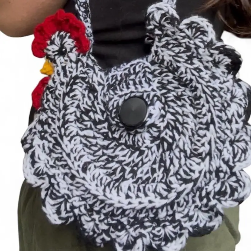 Handmade this chicken purse myself! It has a button closure and is 10inches diameter. It is NOT lined but nothing is falling out of it. I double stranded to create the speckled look. I was able to fit my phone, small wallet, an average size makeup bag and charger! Feel free to ask any questions! 🐓❤️