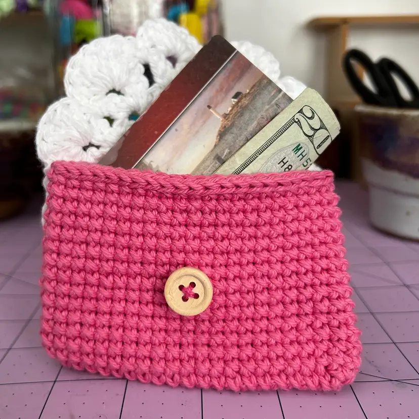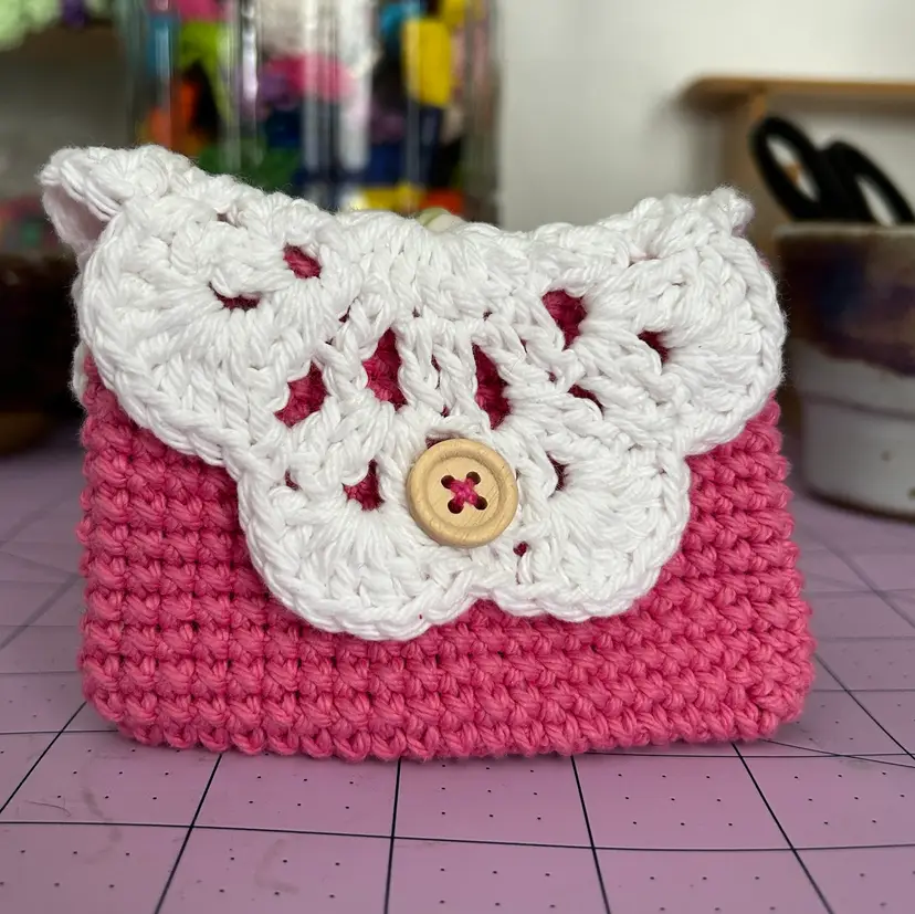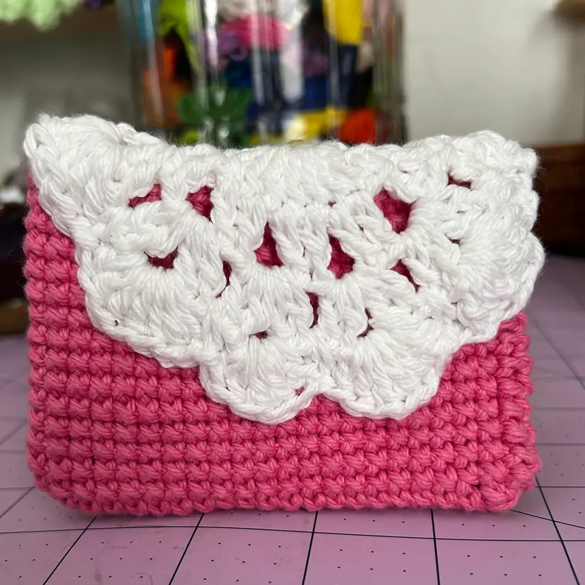 A sweet gift for Valentine's Day! Big enough to hold your ID, credit card, cash ... Made from cotton yarn. Pink and White Measures 5" across and 3" tall. Made in a ๐ญ smoke FREE, ๐พ two CAT home.