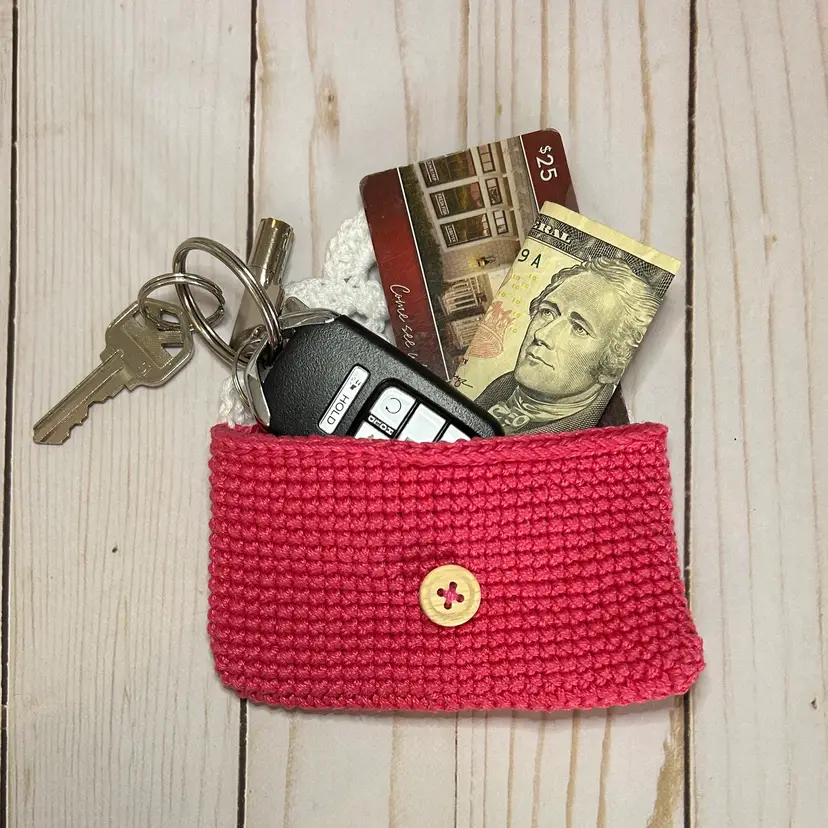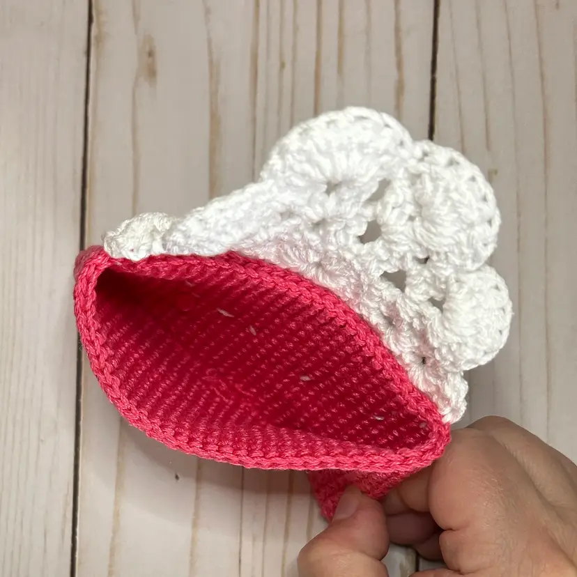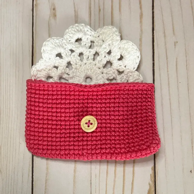 A sweet gift for Valentine's Day! Big enough to hold your ID, credit card, cash ... Made from 100% mercerized cotton. Rose pink and White Measures 5" across and 3" tall. Made in a ๐ญ smoke FREE, ๐พ two CAT home.