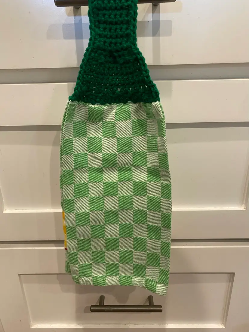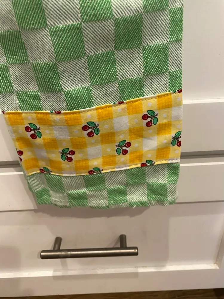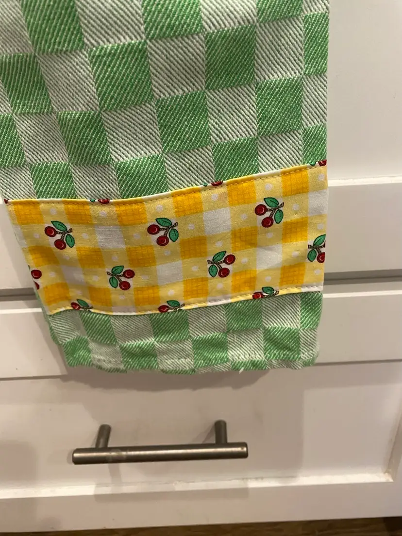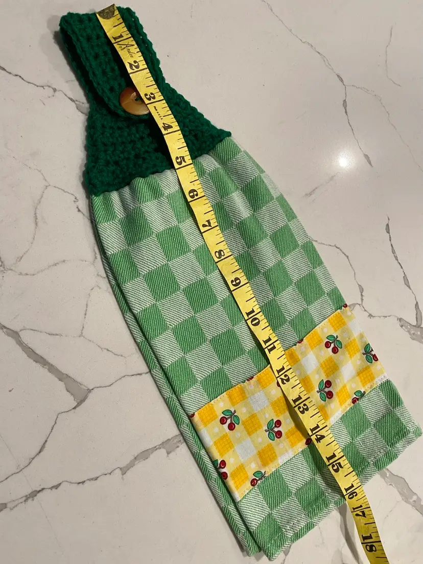 Cute handmade kitchen towel. Green checkered towel, green crochet top, hand sewn cherries fabric panel measures 6.5” x 17”