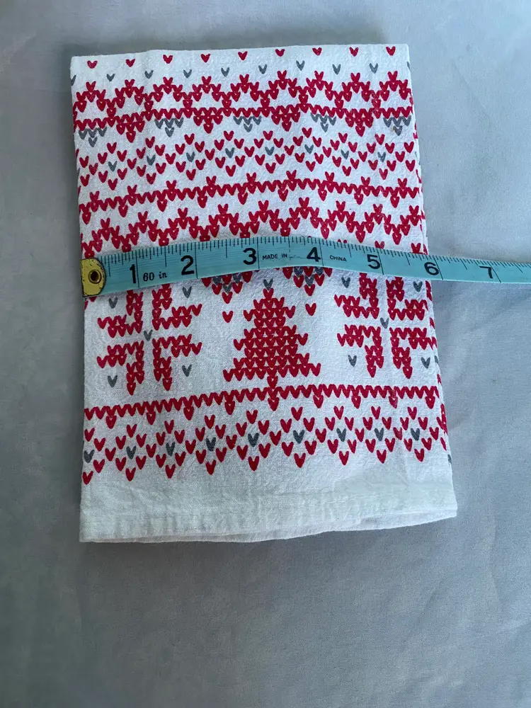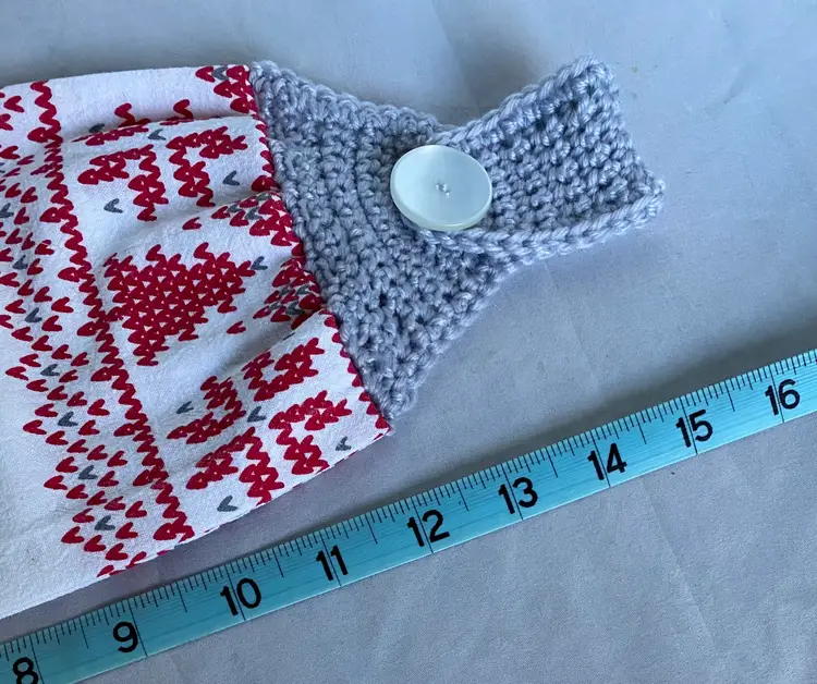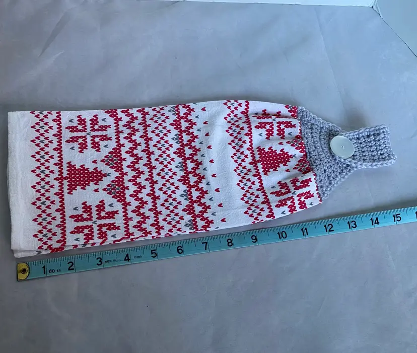 Hand crochet topper light gray hanger large white button white, red, gray cotton flour sack style towel Red trees and snowflakes measures 6" x 16"