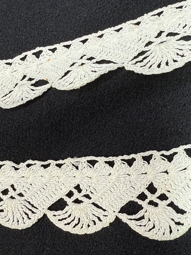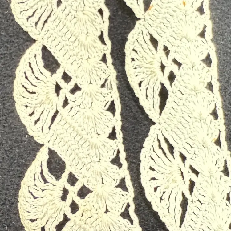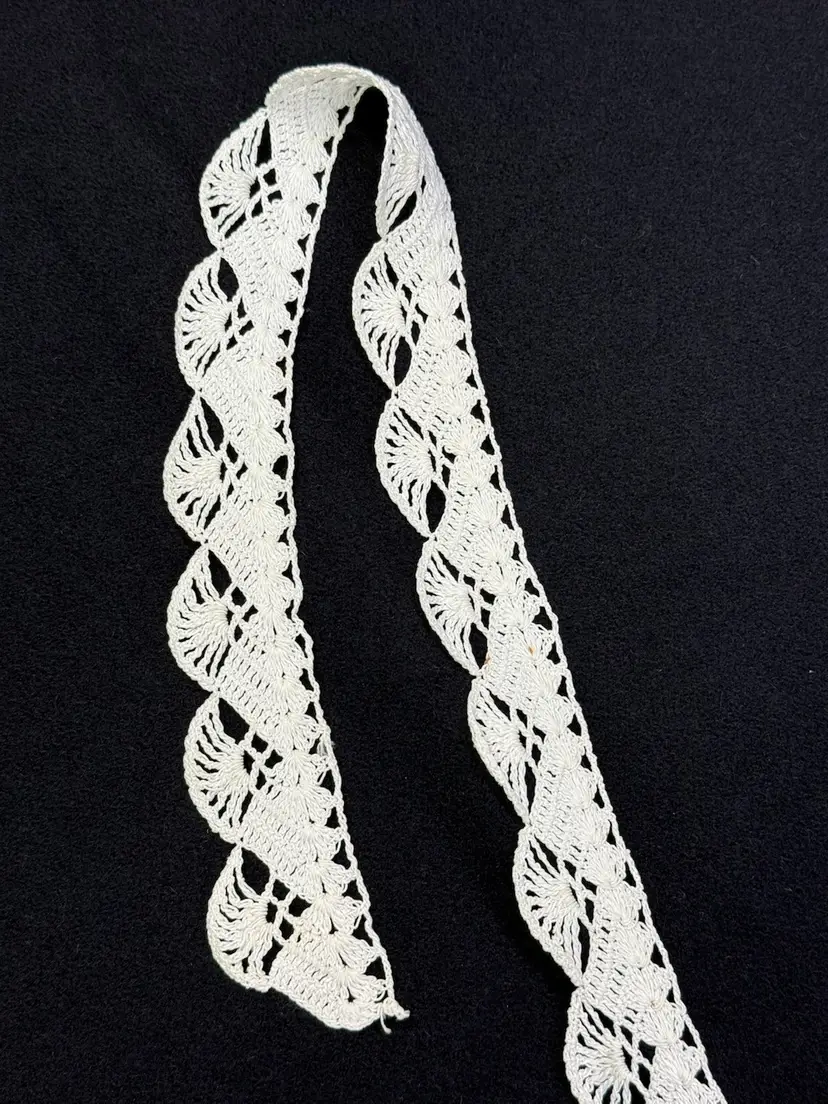 Crocheted, aged to ivory lace. One straight edge, one scalloped edge. 1 ⅜” wide. 7 Yards long. In one piece. Excellent condition.