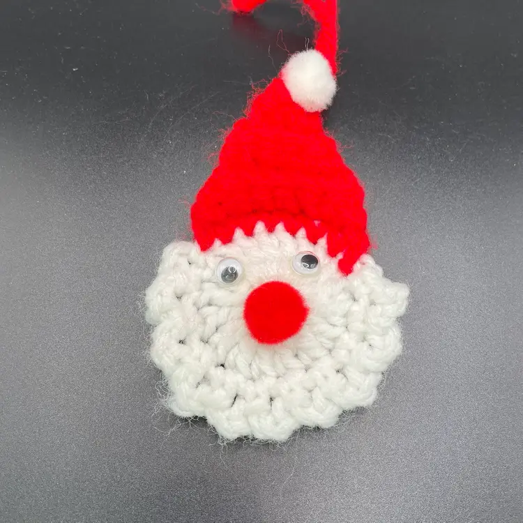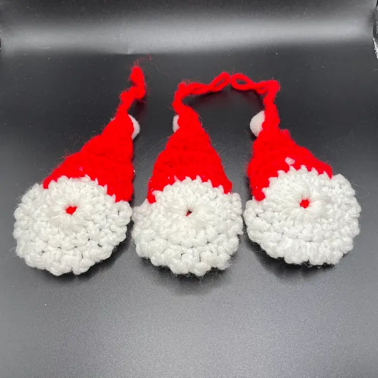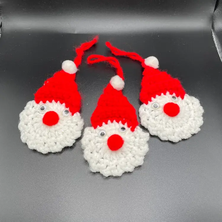 This is a set of 3 handmade crocheted Santa Claus heads hanging ornaments. Each measure approximately 4.5" long x 2.5" wide. No snags or stains. Smoke free home.
