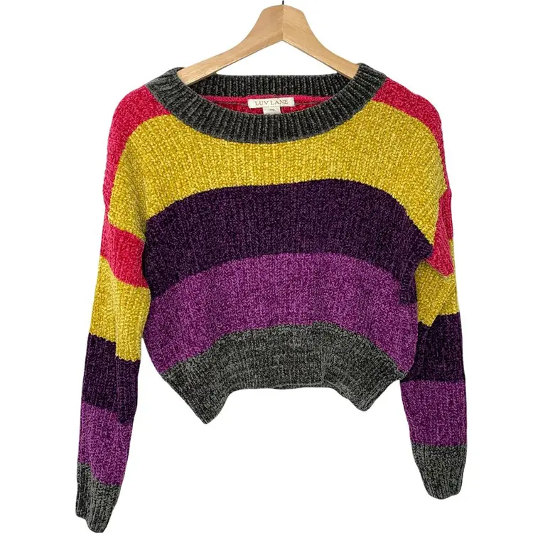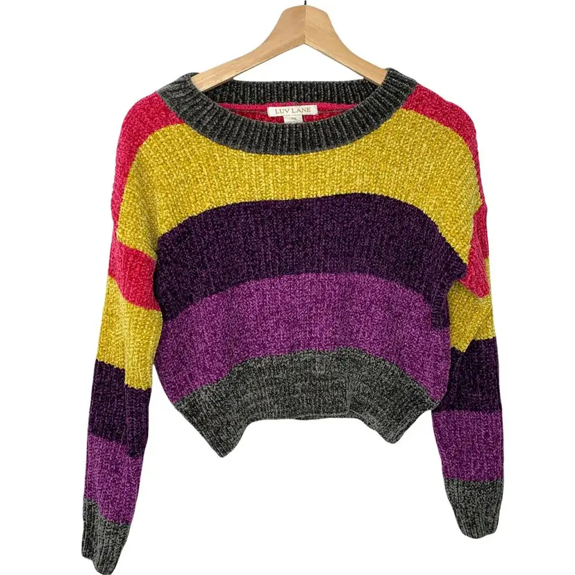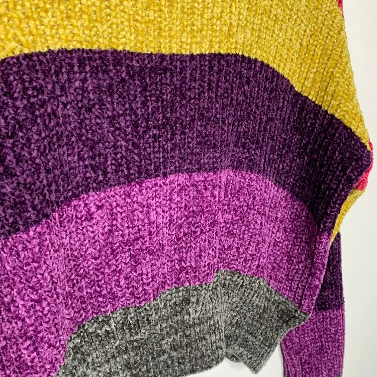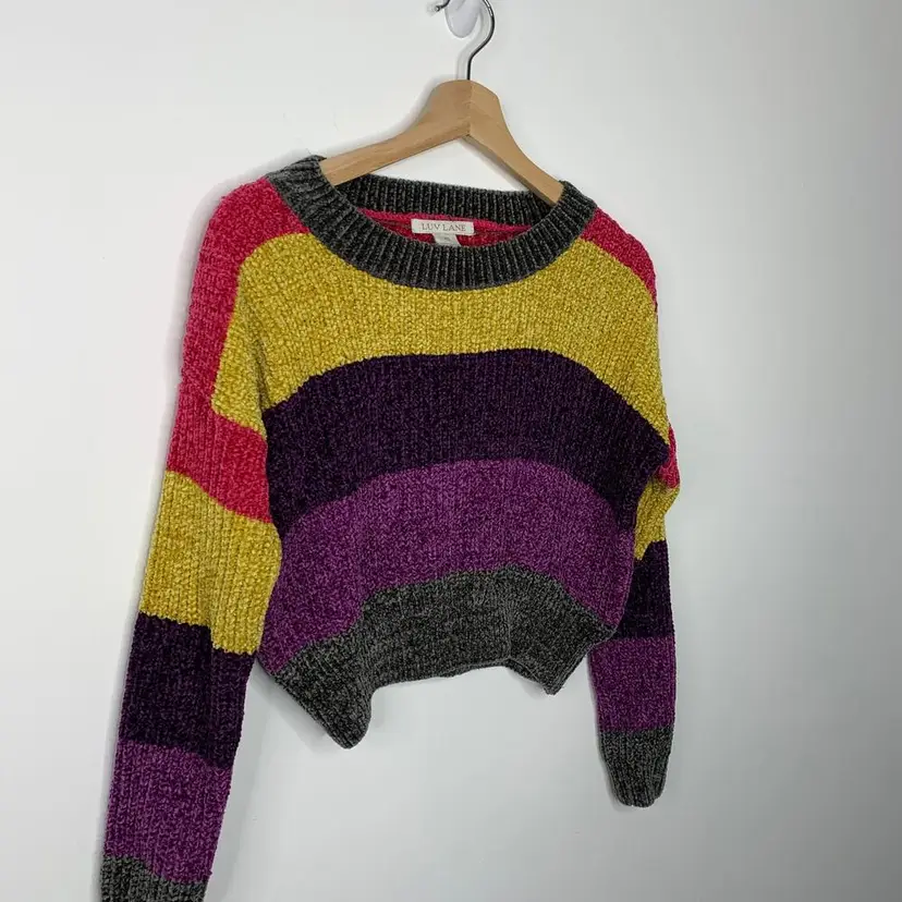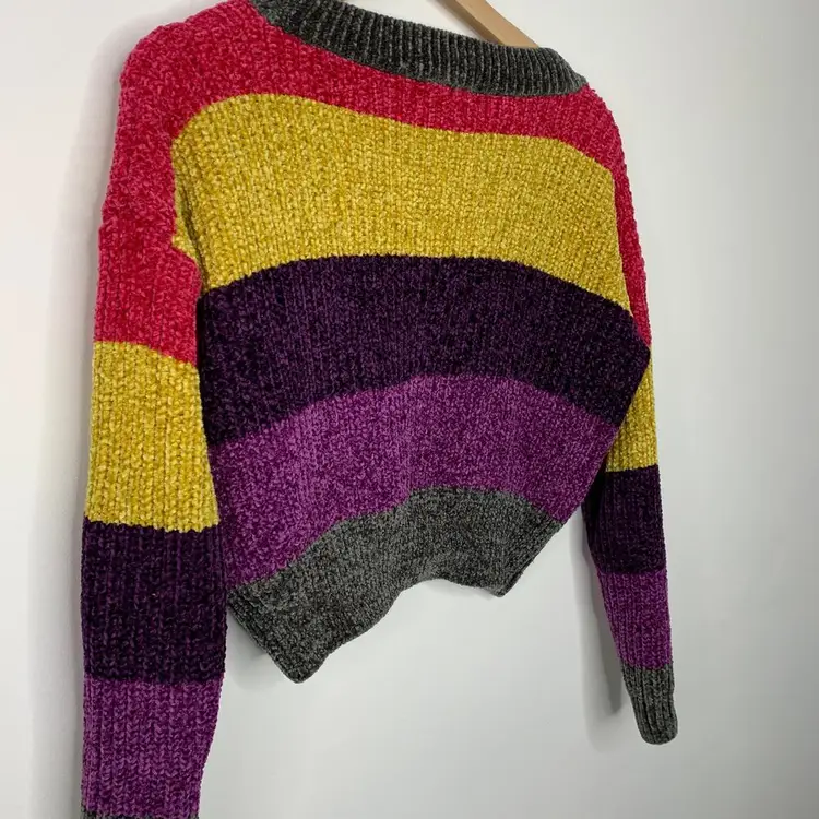 Adorable and super soft, cropped sweater in women's XS Pre-loved excellent condition. 100% polyester, crew neck, long sleeve Pink, yellow, gray, purple, eggplant, mustard Funky and colorful Oversized for an XS, roomy and comfortable